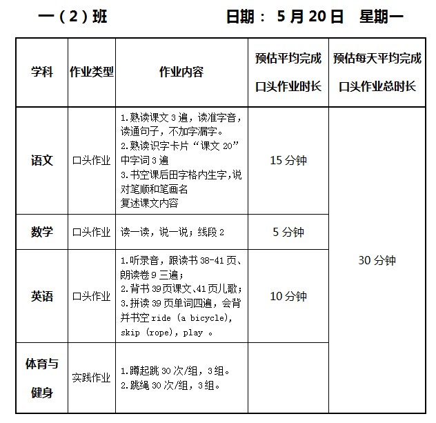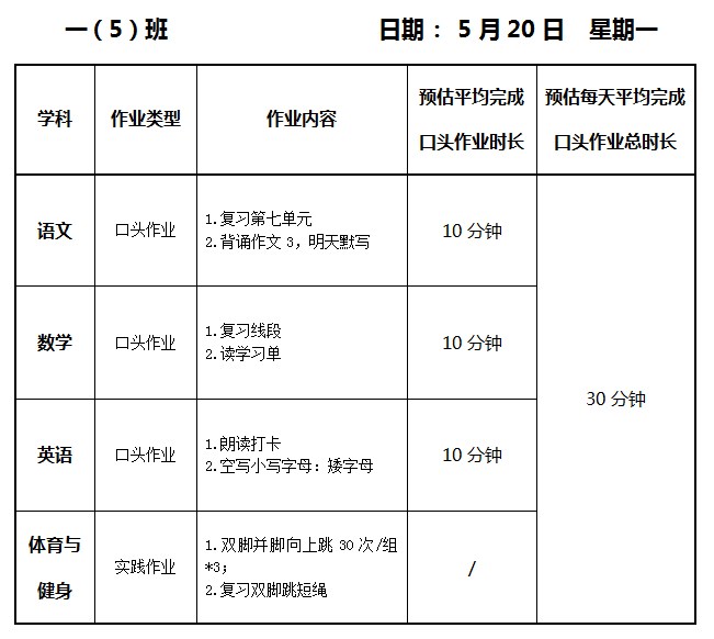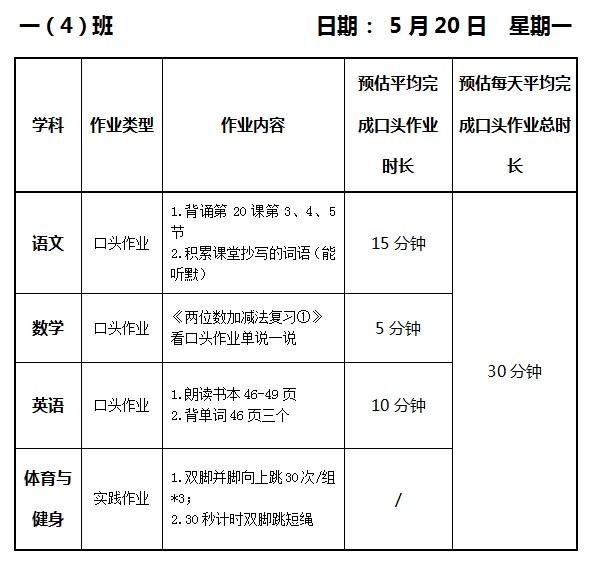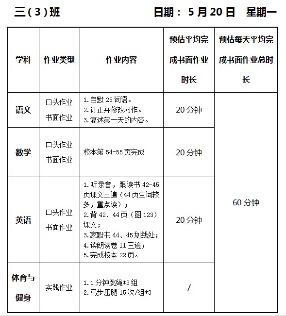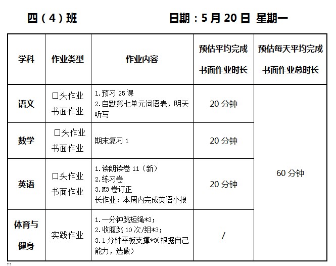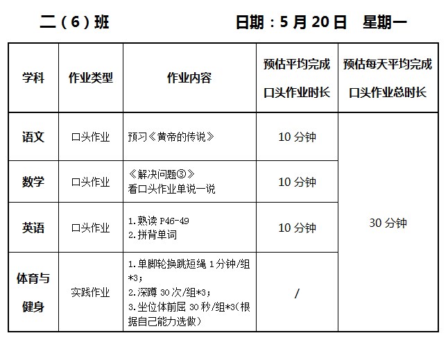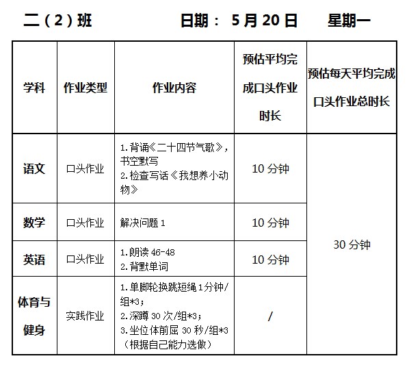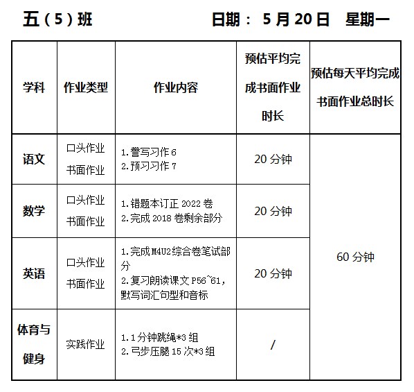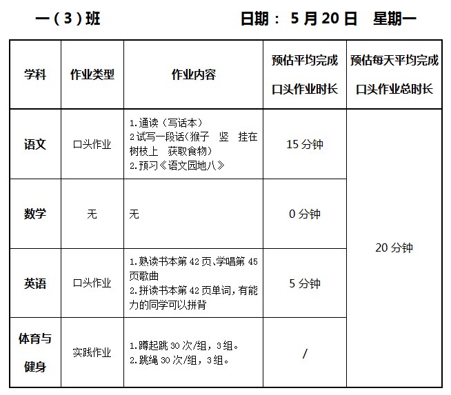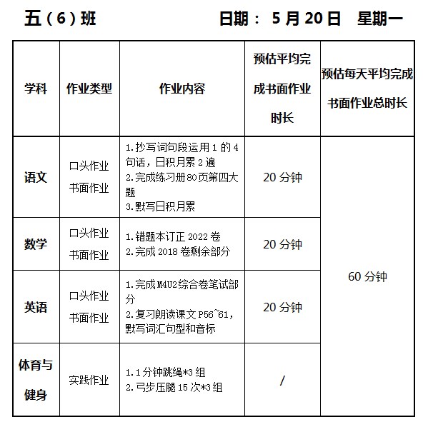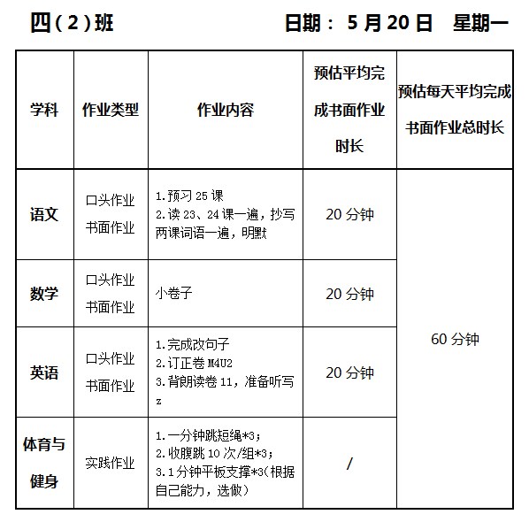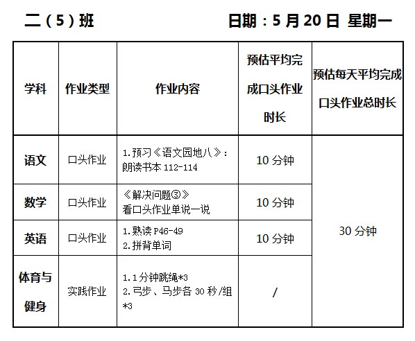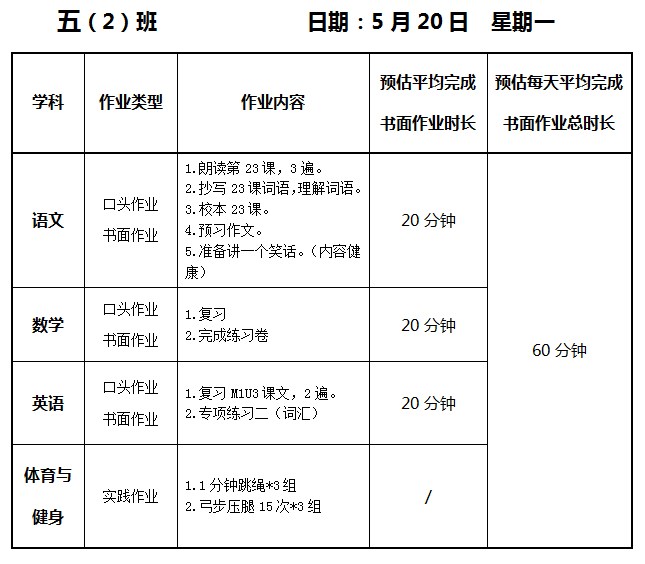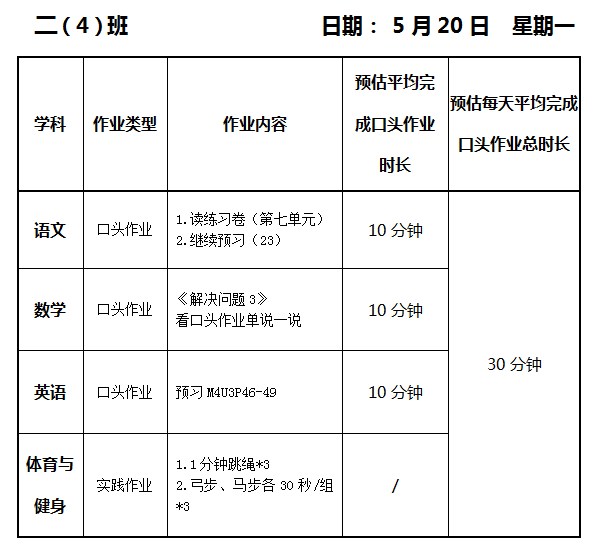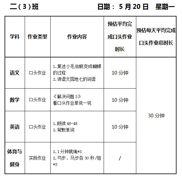 【作业公示】2023学年第二学期南翔小学作业公示(5月20日)