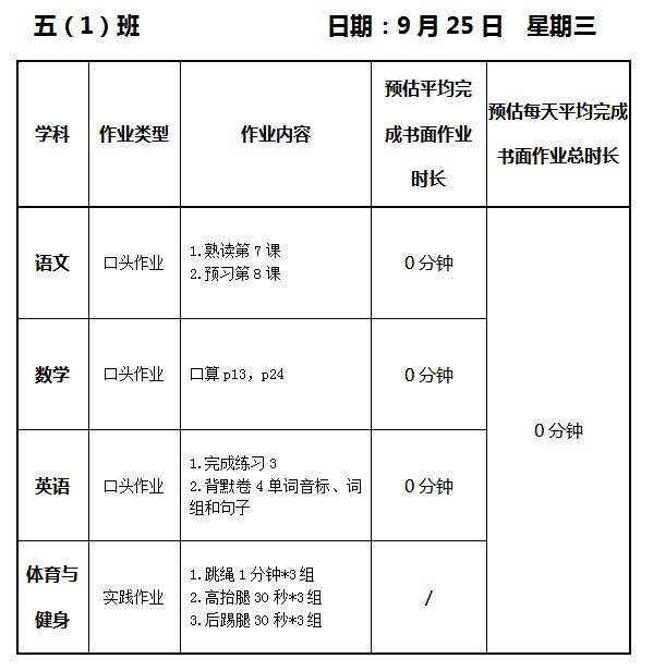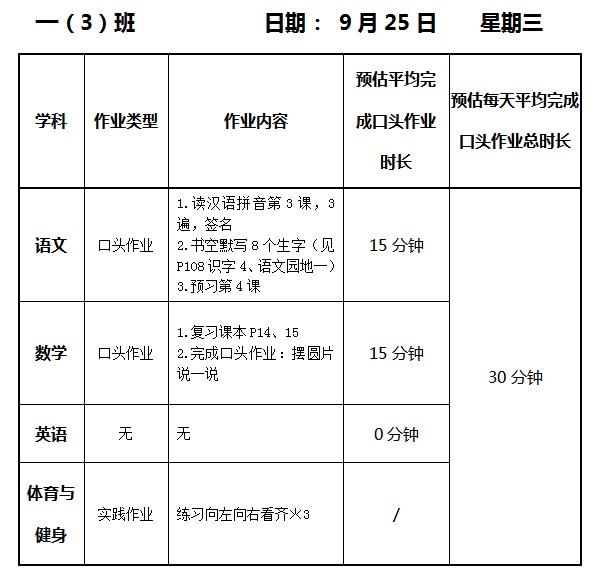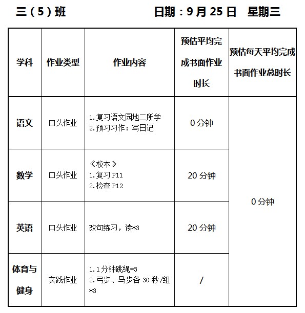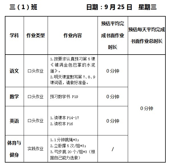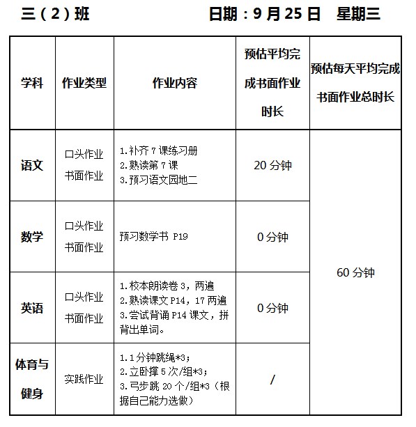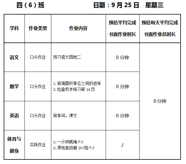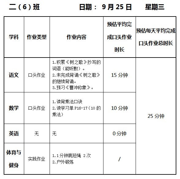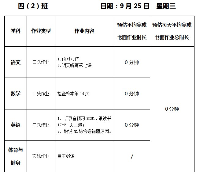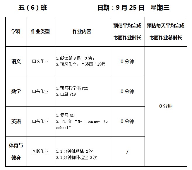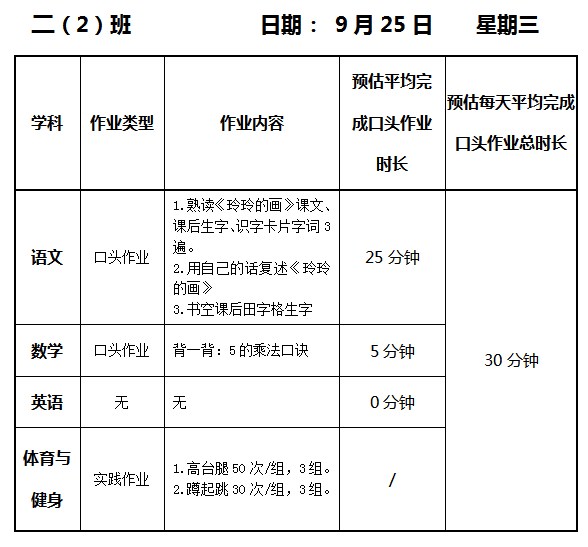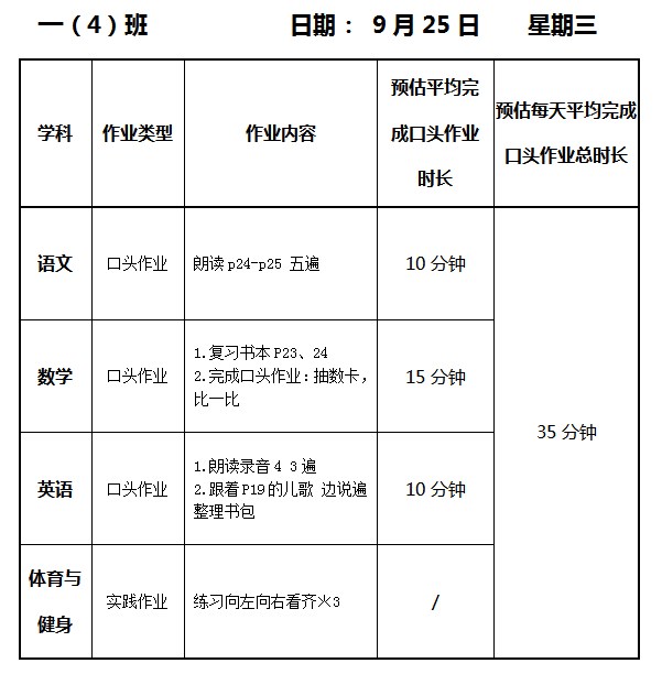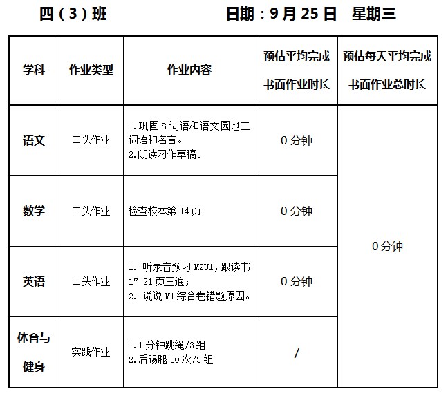【作业公示】2024学年第一学期南翔小学作业公示(9月25日)
