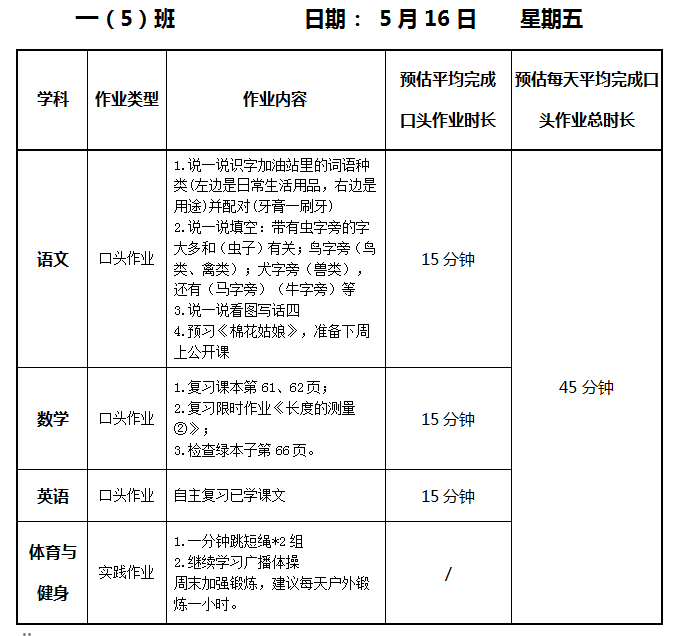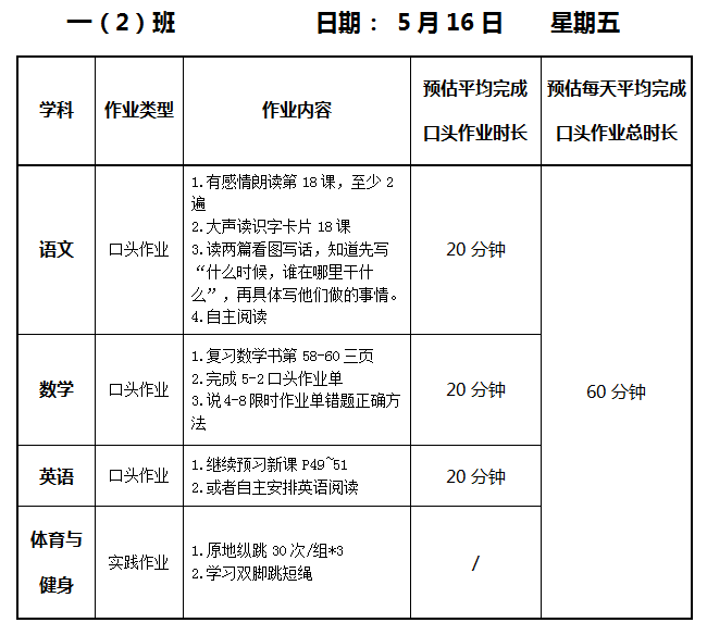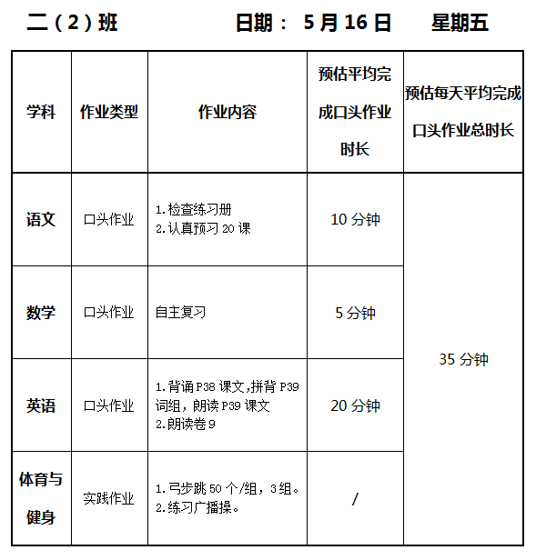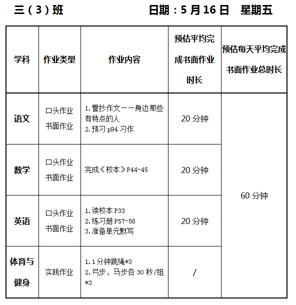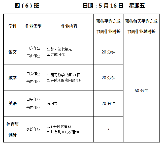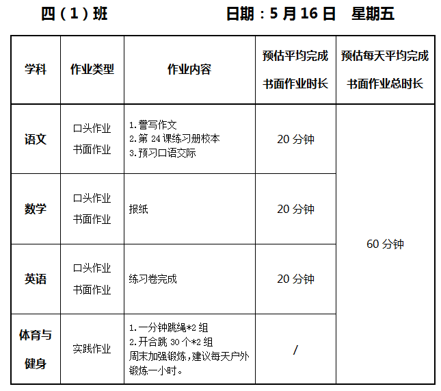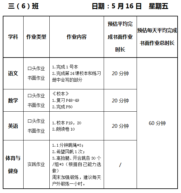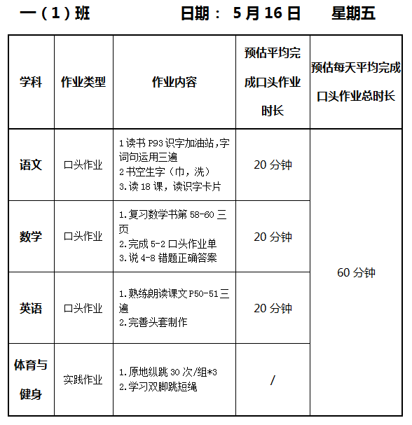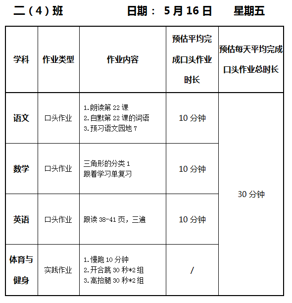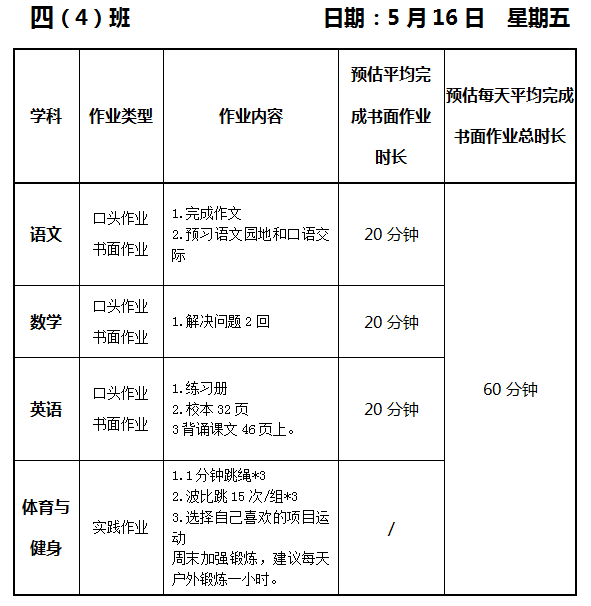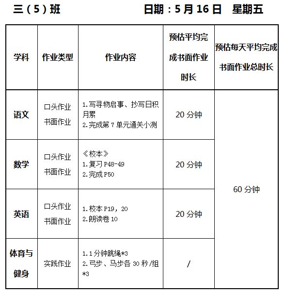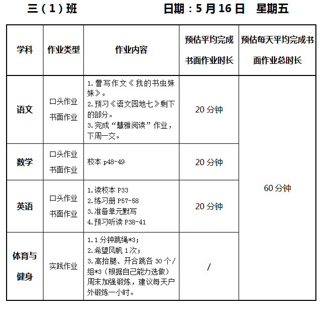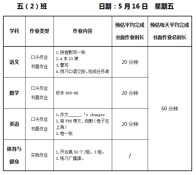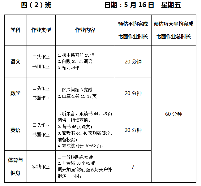 【作业公示】2024学年第二学期南翔小学作业公示(5月16日)