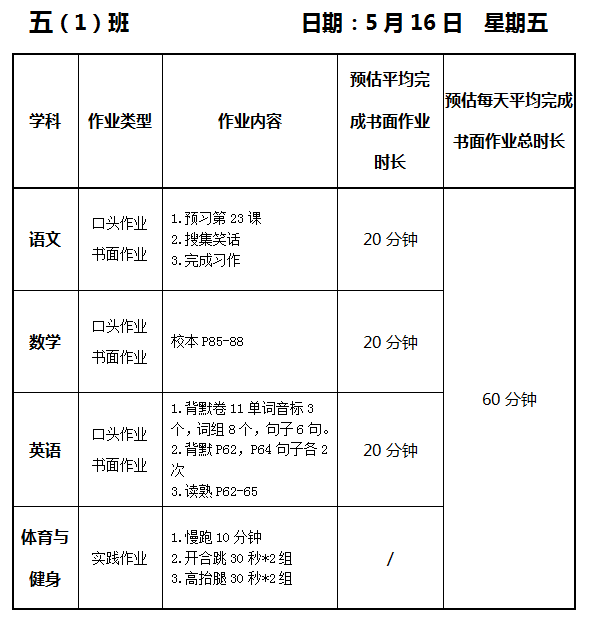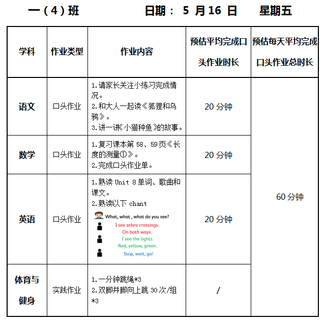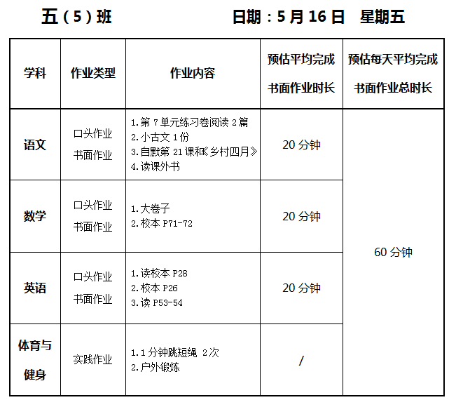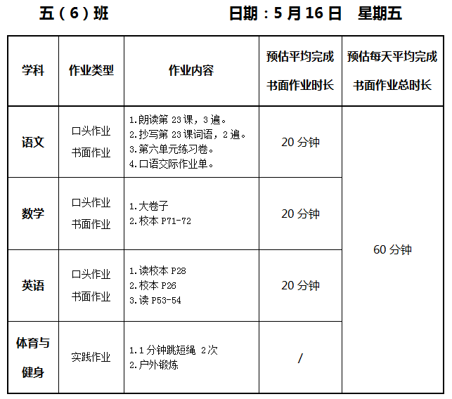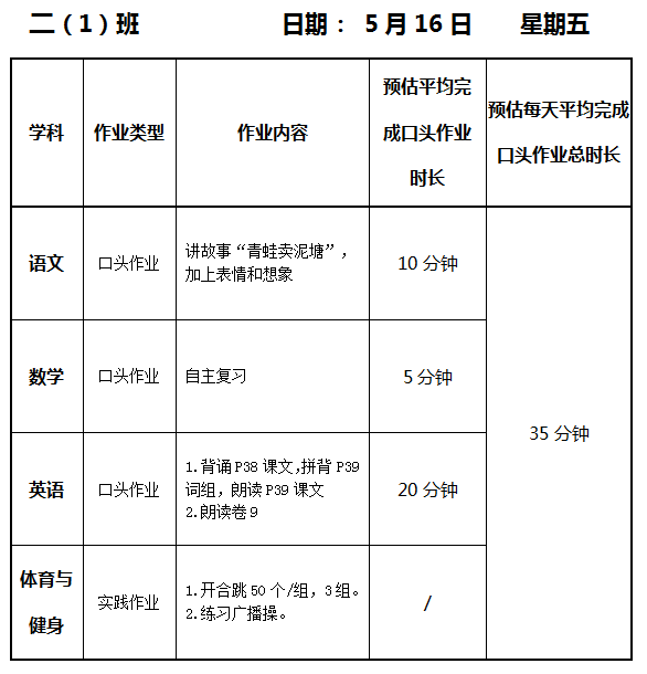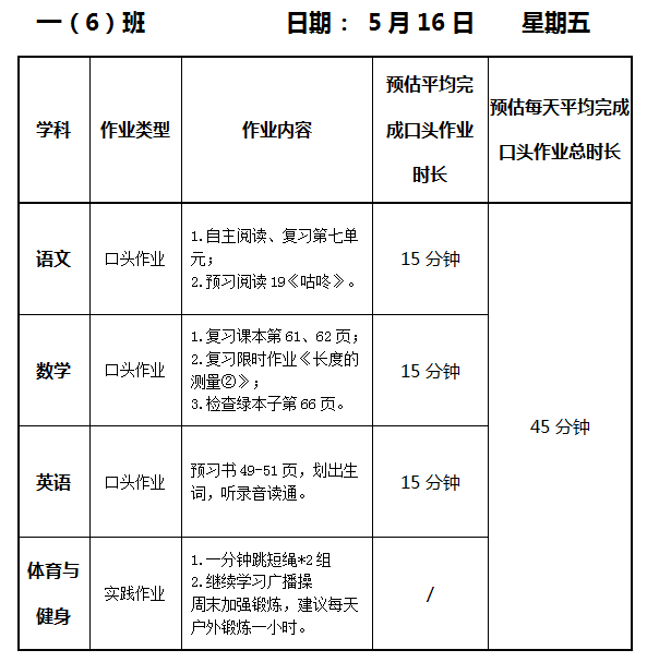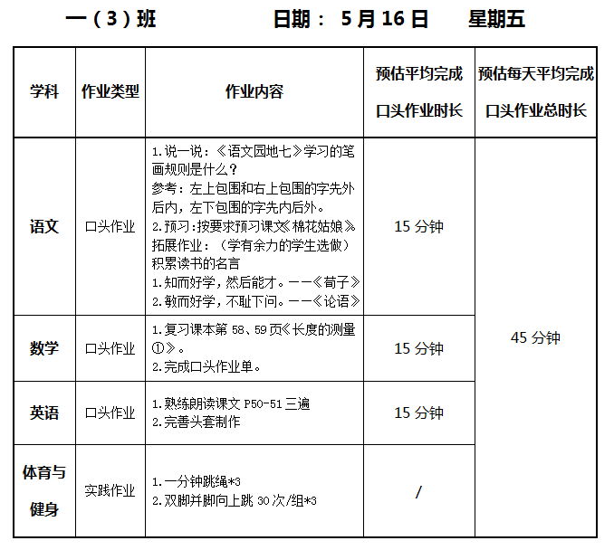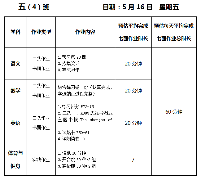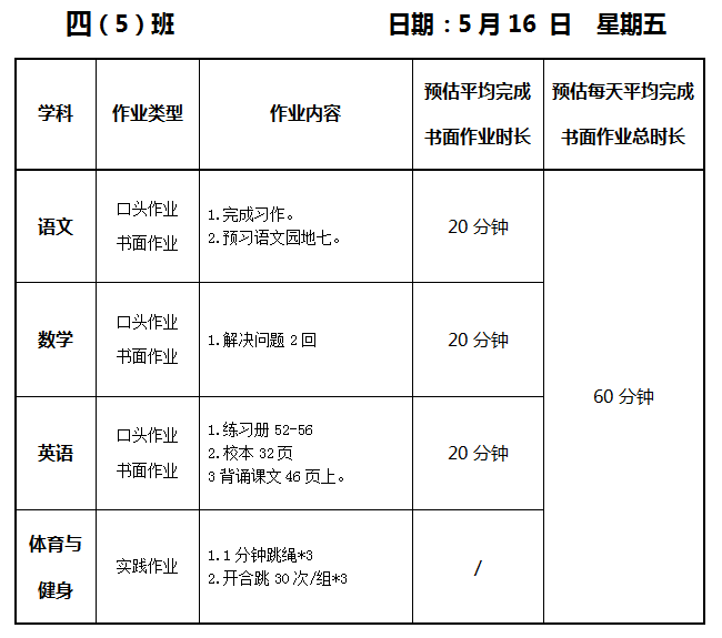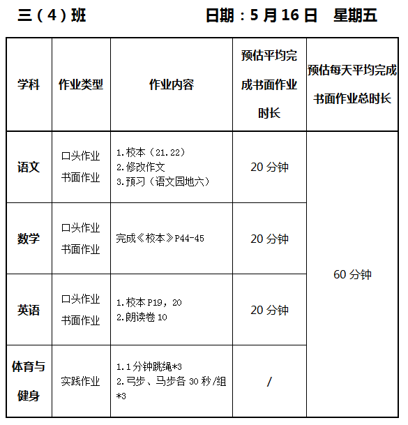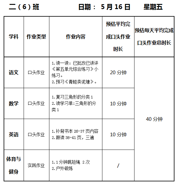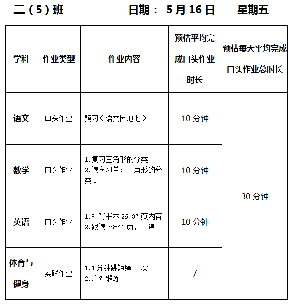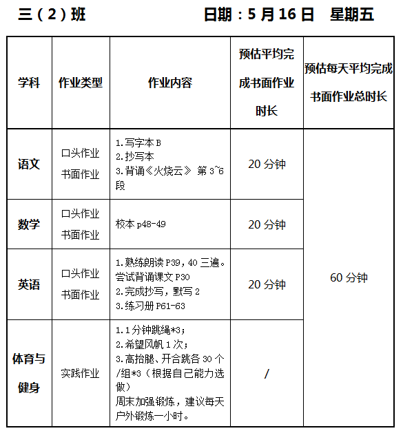 【作业公示】2024学年第二学期南翔小学作业公示(5月16日)