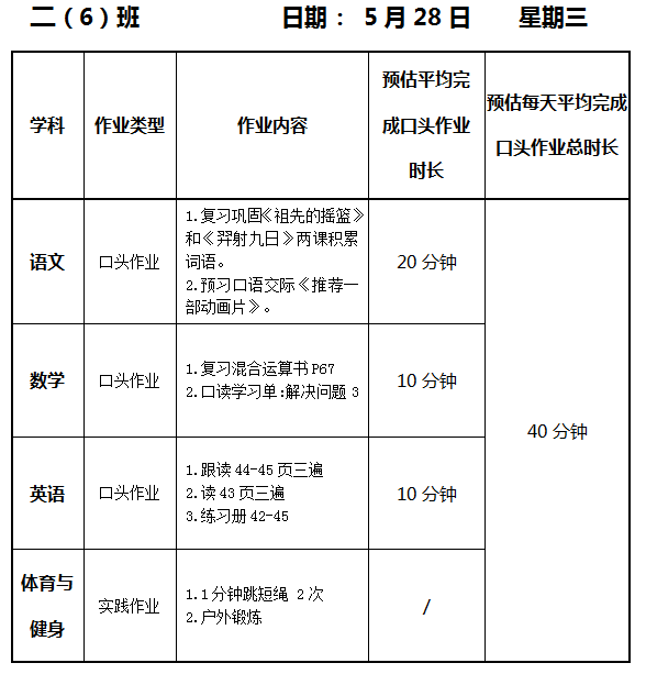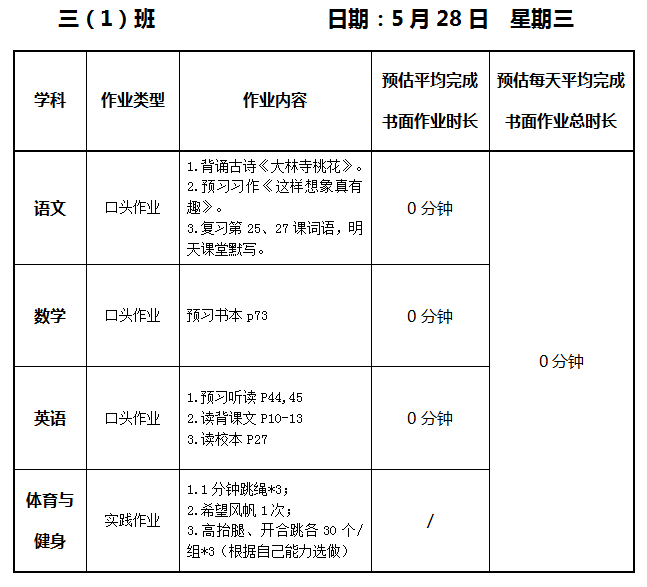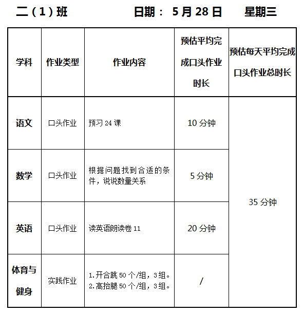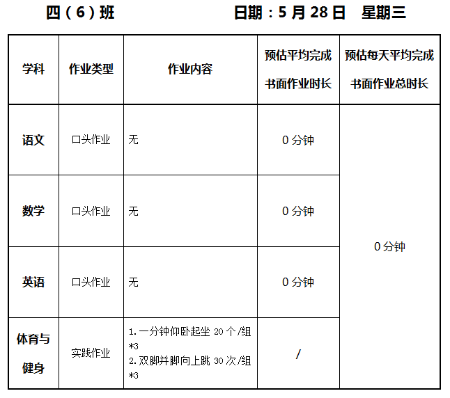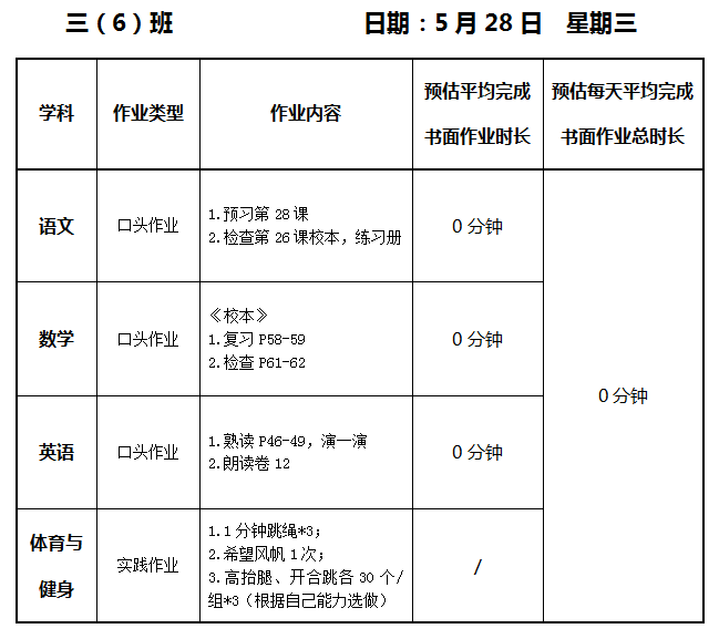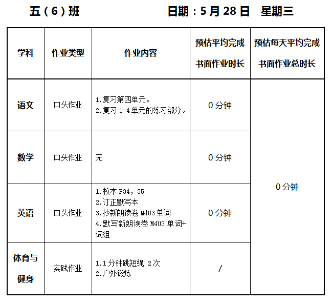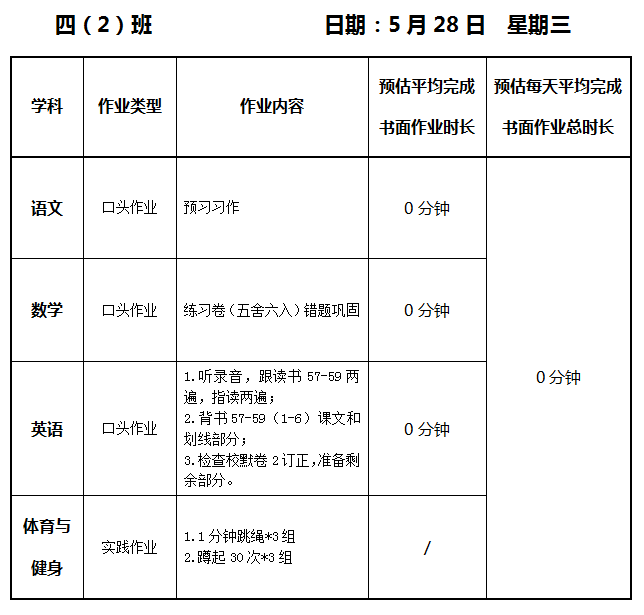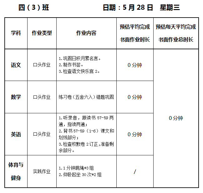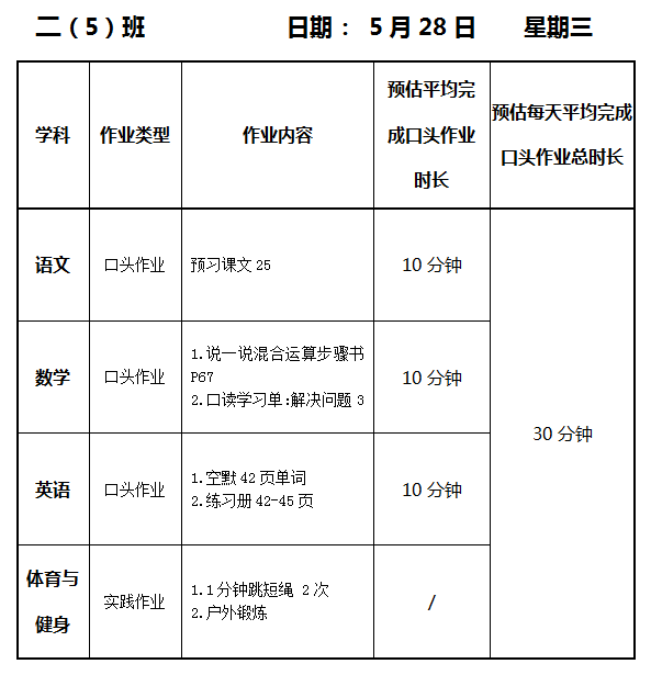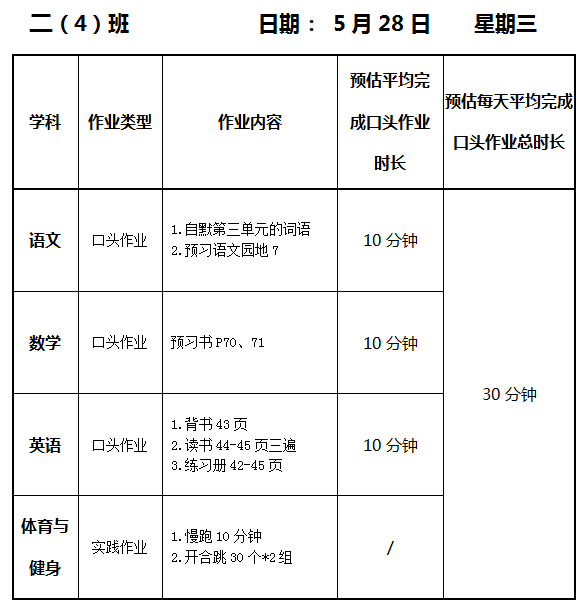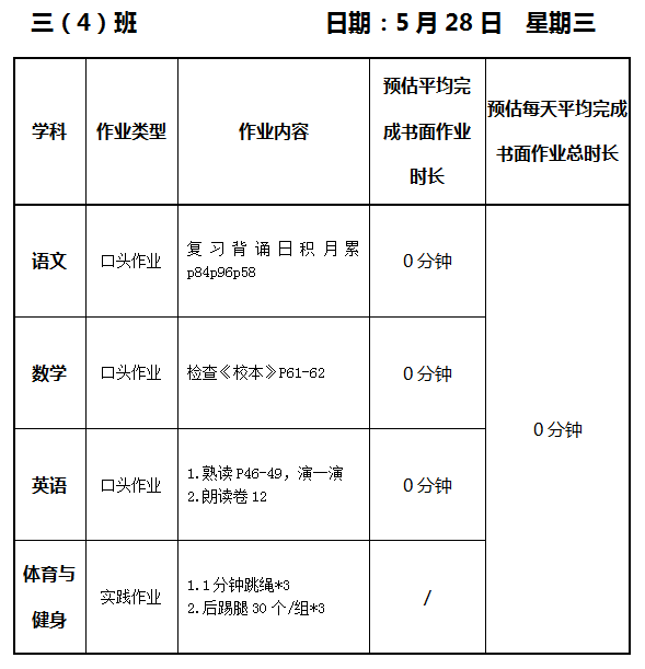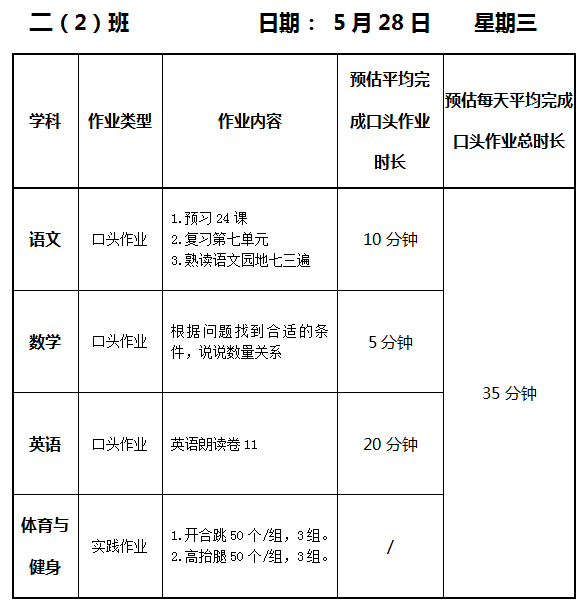 【作业公示】2024学年第二学期南翔小学作业公示(5月28日)