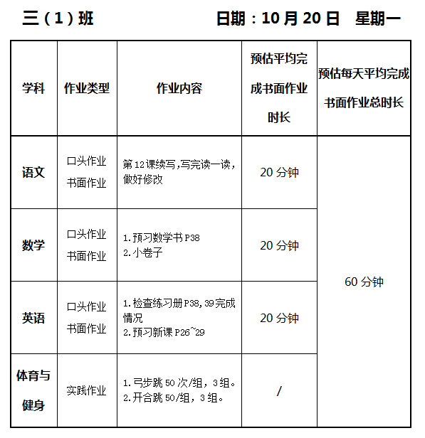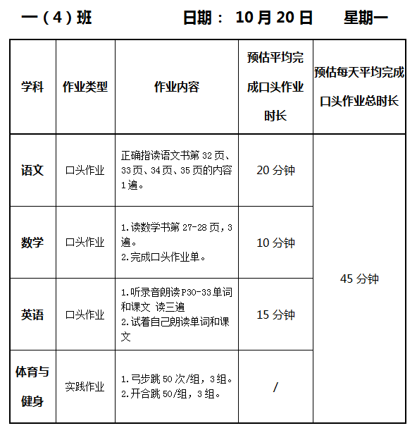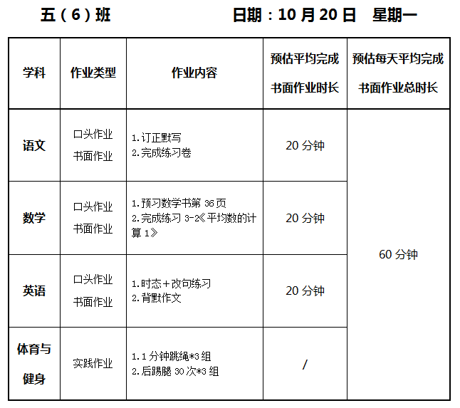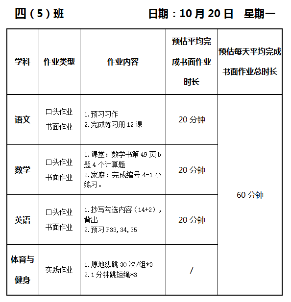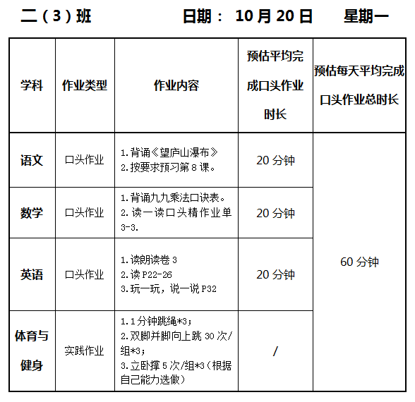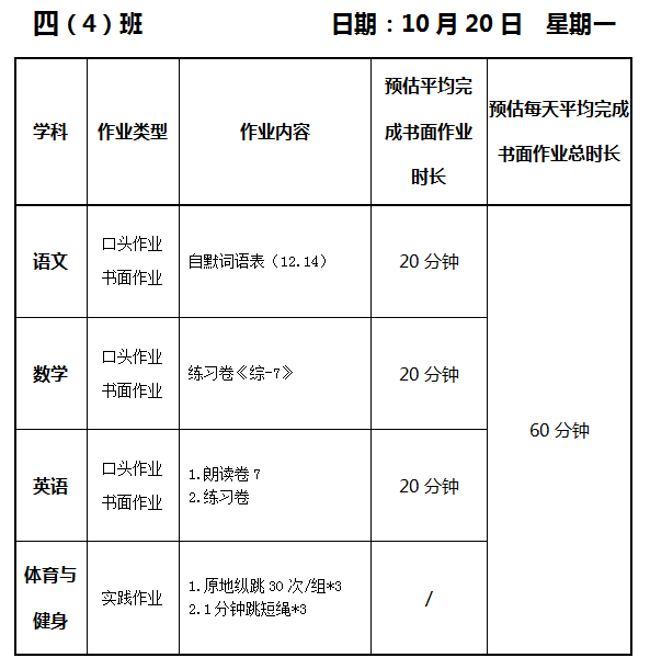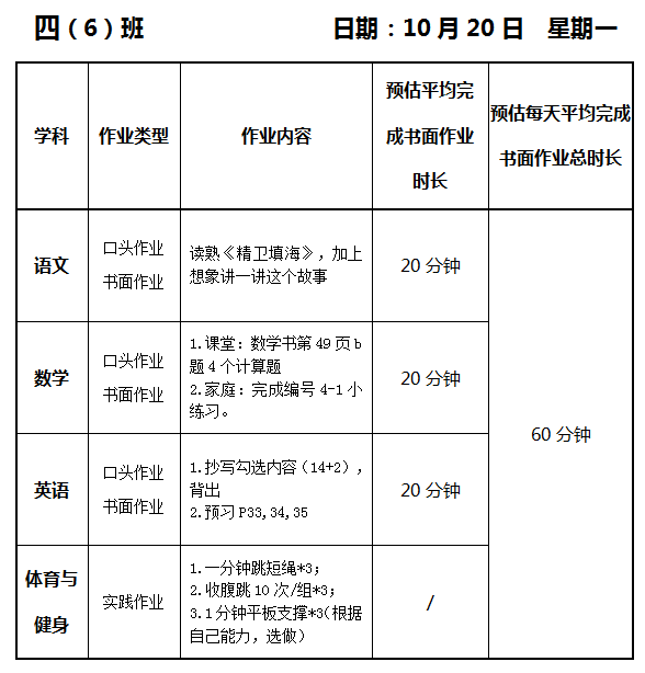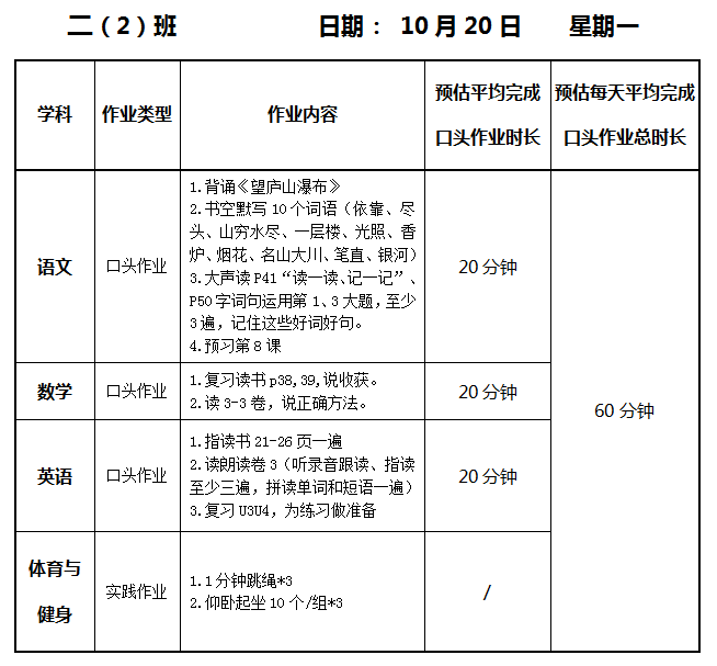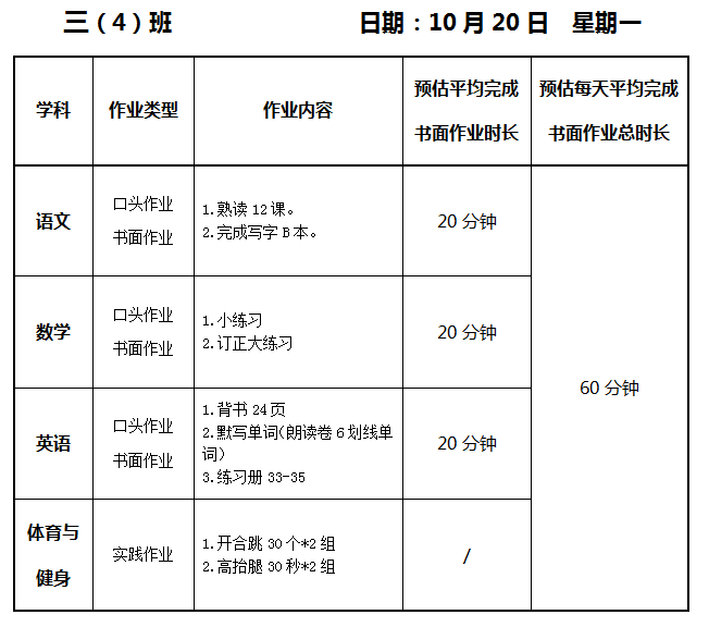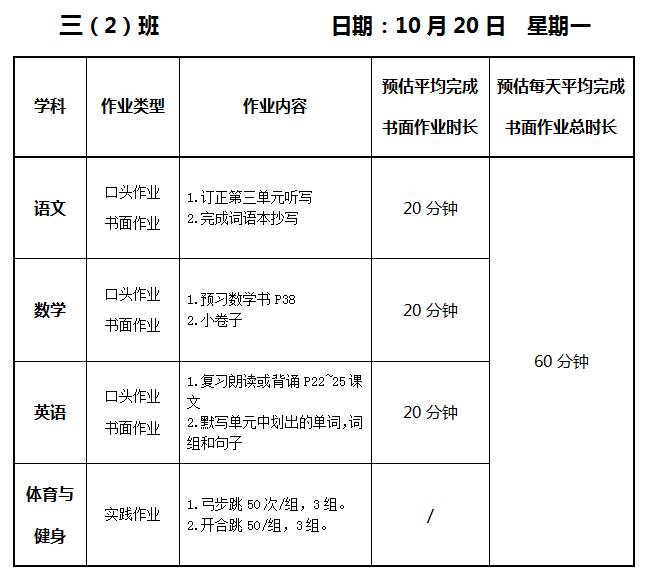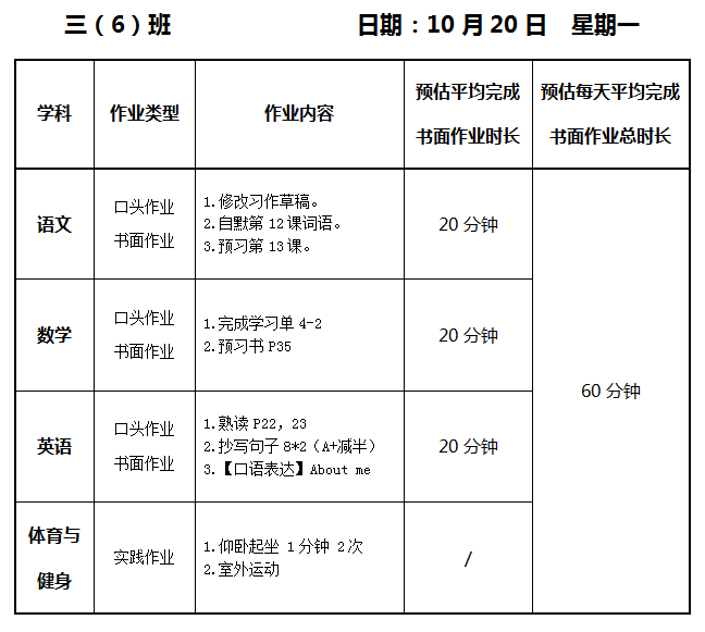 【作业公示】2025学年第一学期南翔小学作业公示(10月20日)