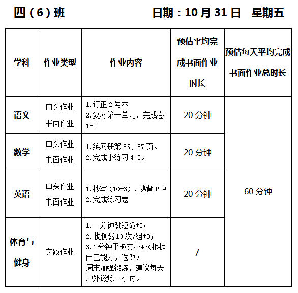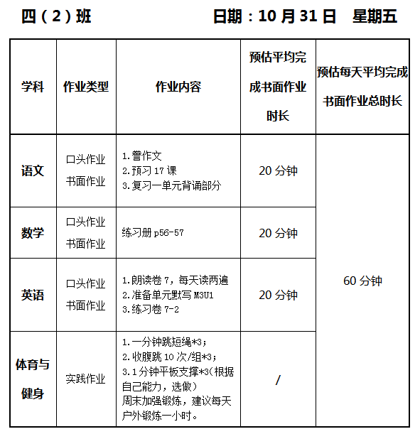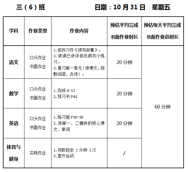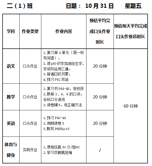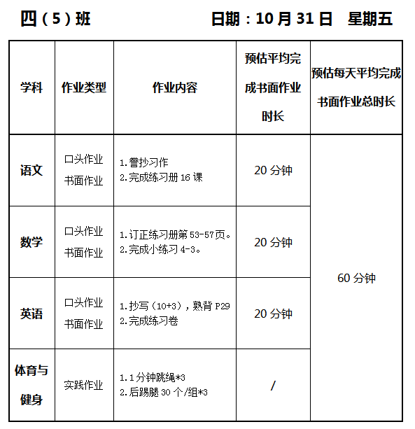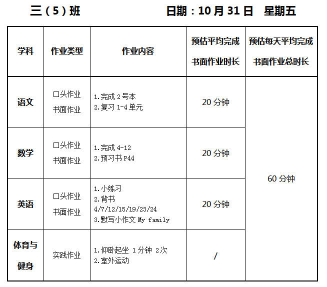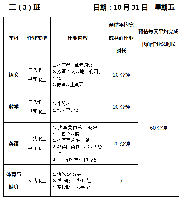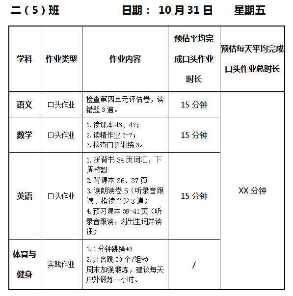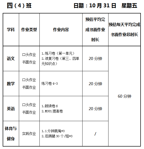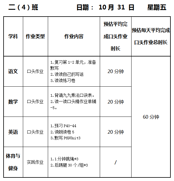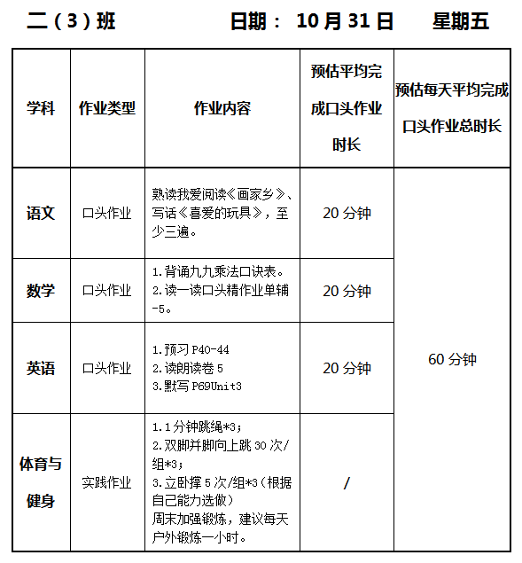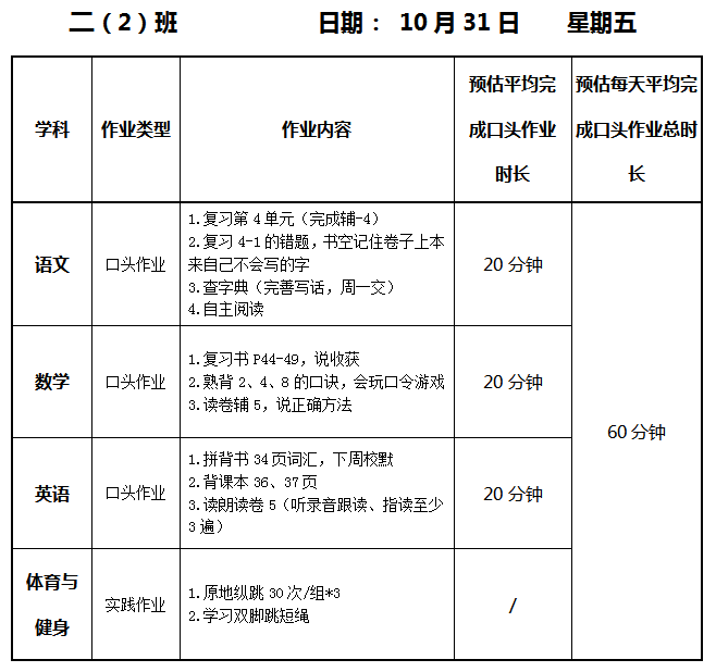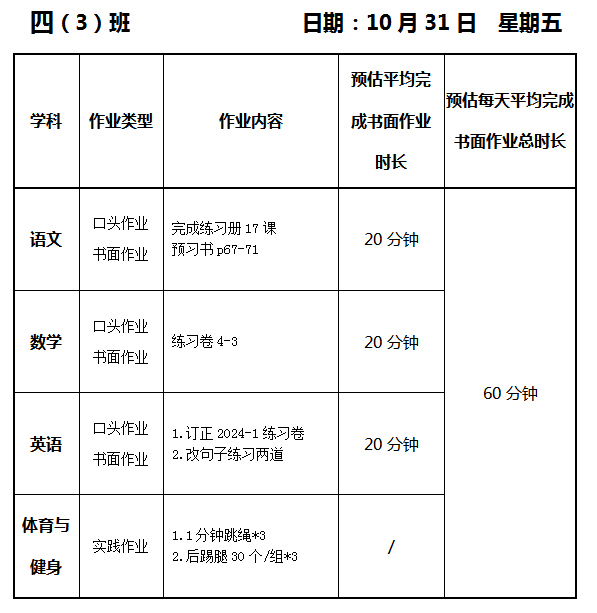 【作业公示】2025学年第一学期南翔小学作业公示(10月31日)