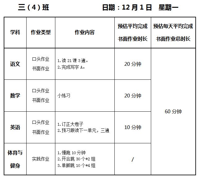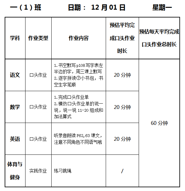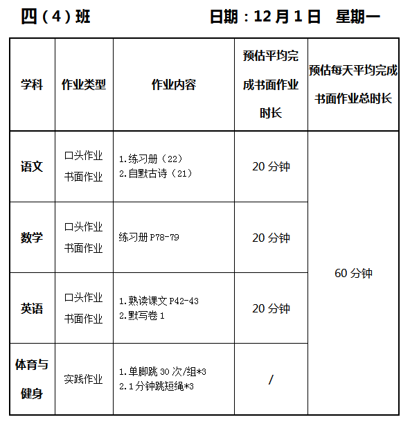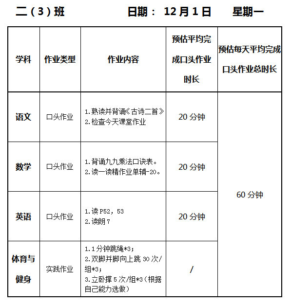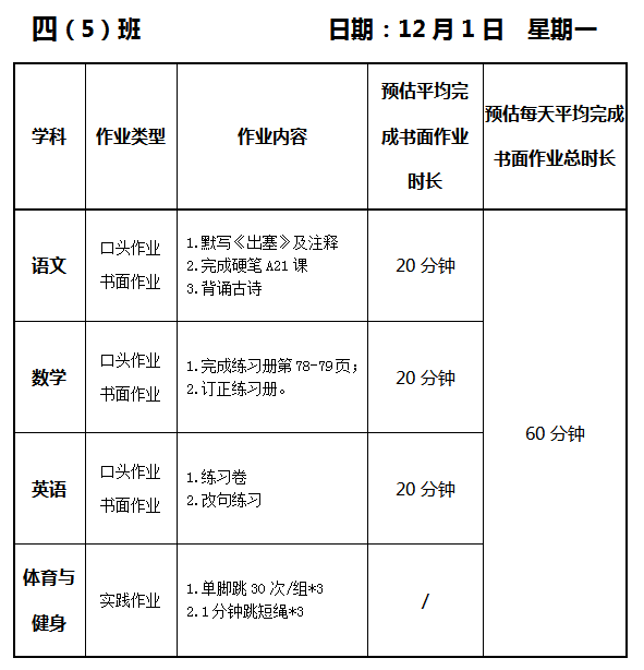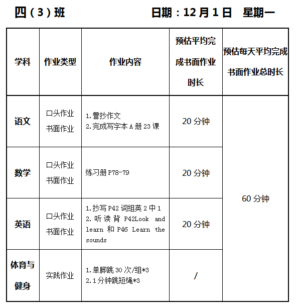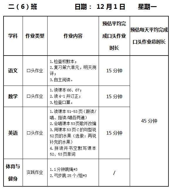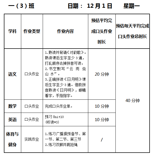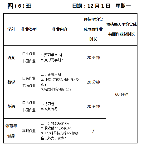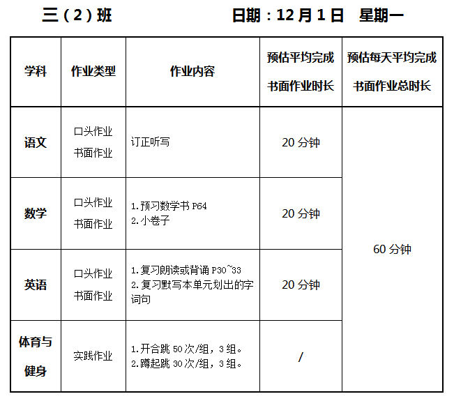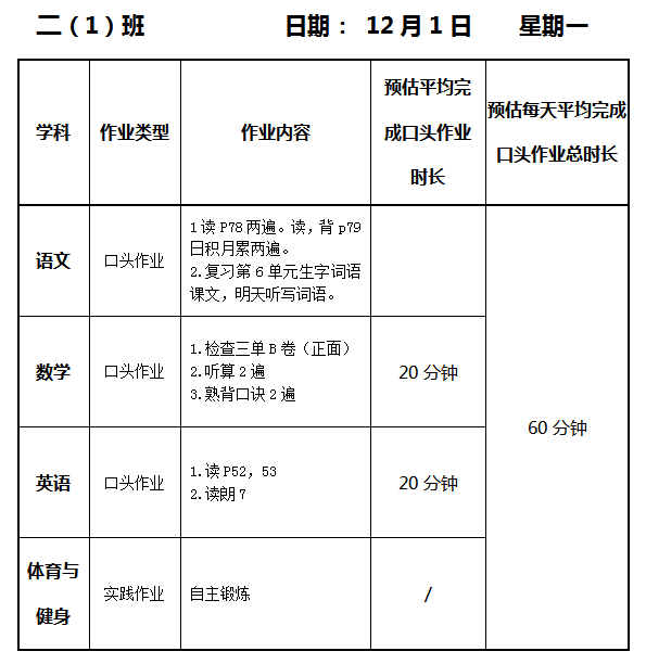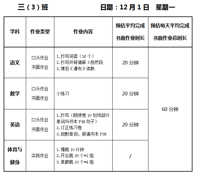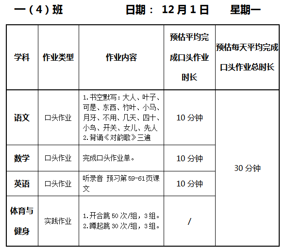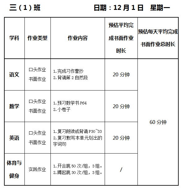 【作业公示】2025学年第一学期南翔小学作业公示(12月1日)