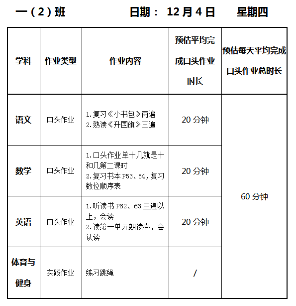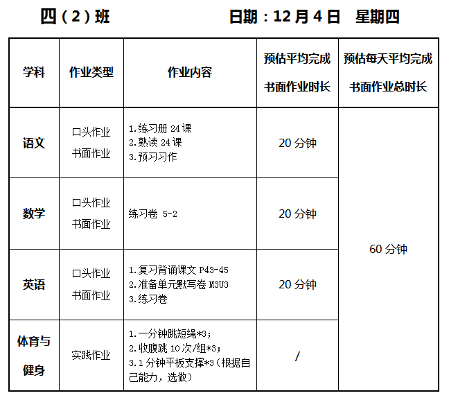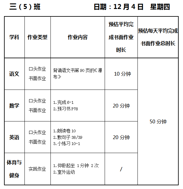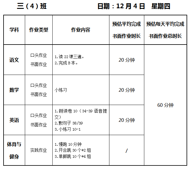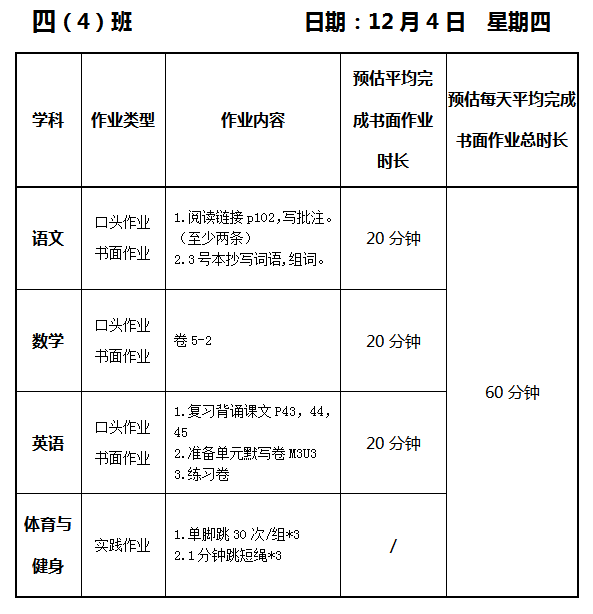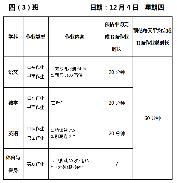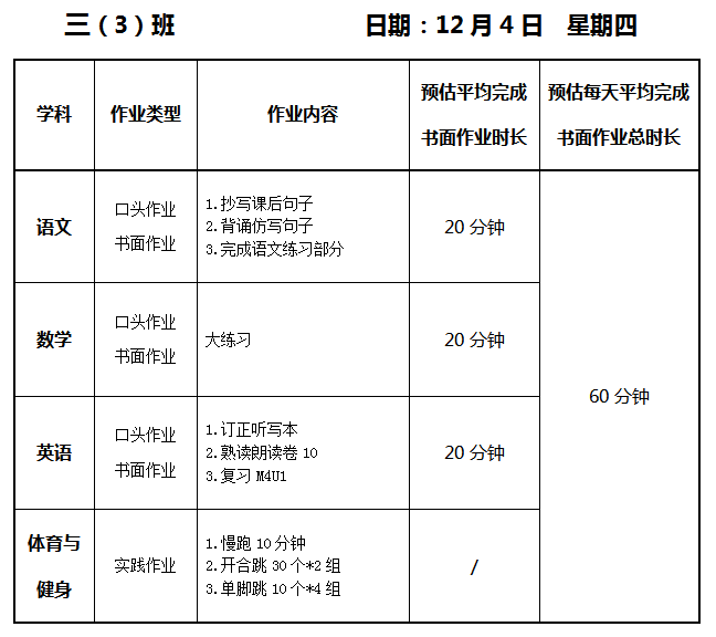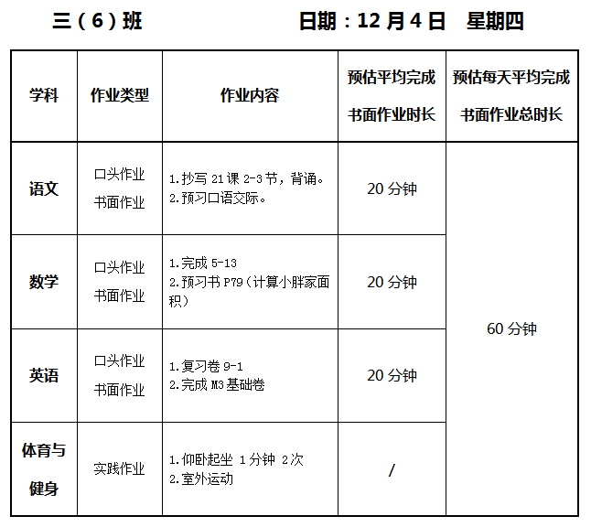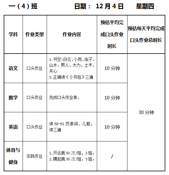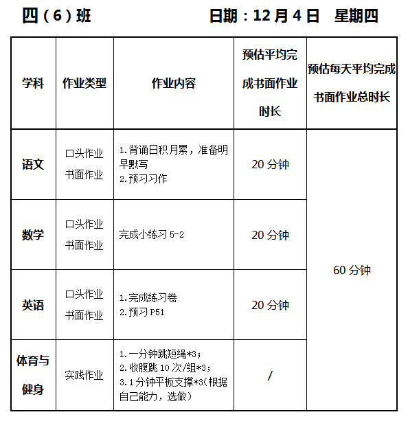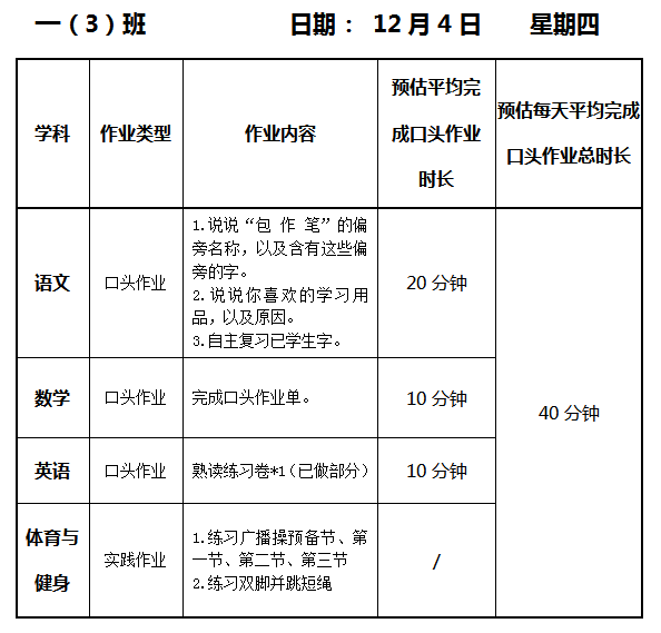 【作业公示】2025学年第一学期南翔小学作业公示(12月4日)