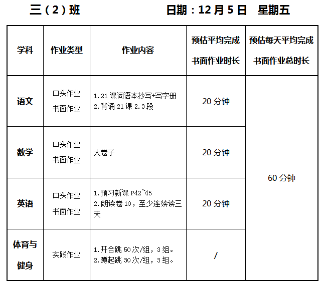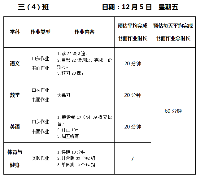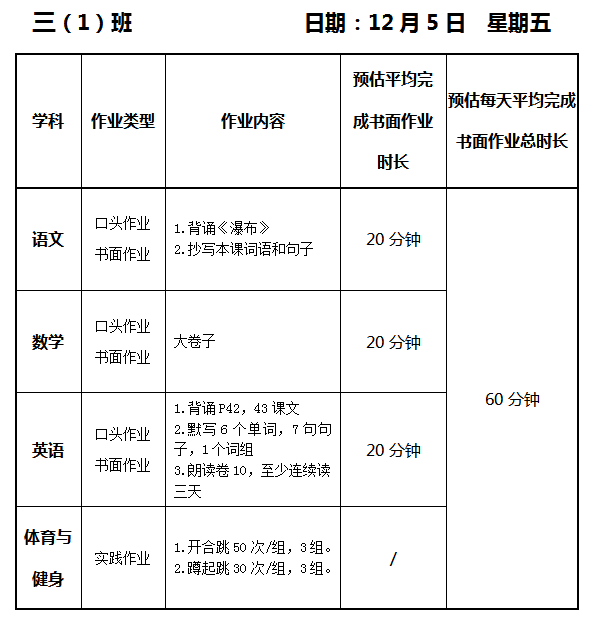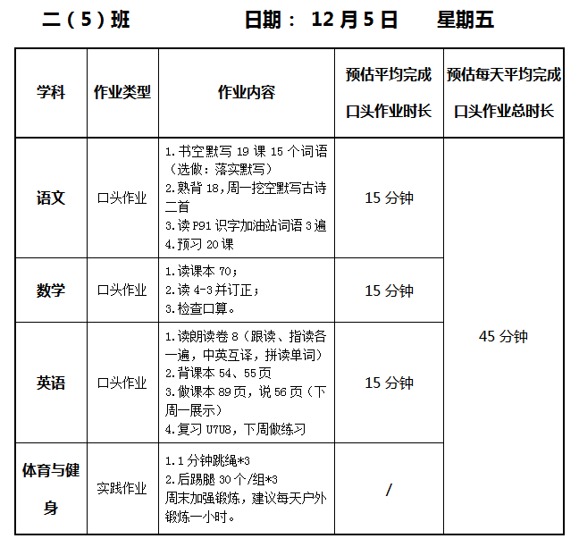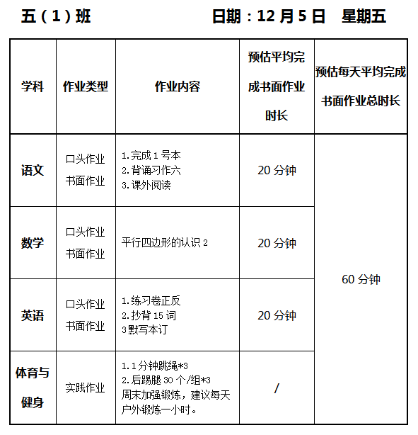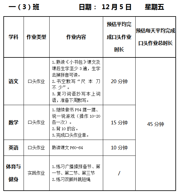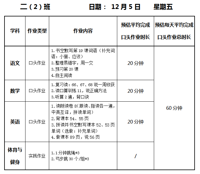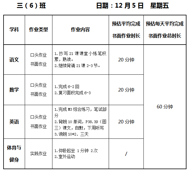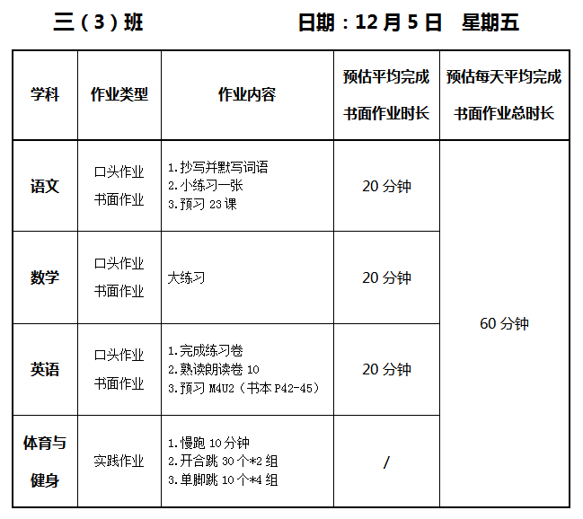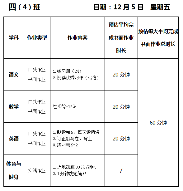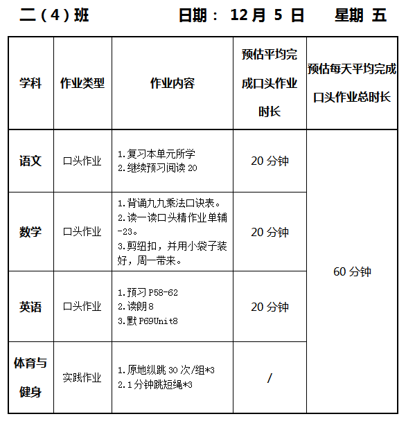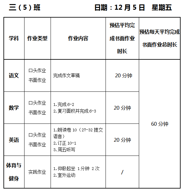 【作业公示】2025学年第一学期南翔小学作业公示(12月5日)