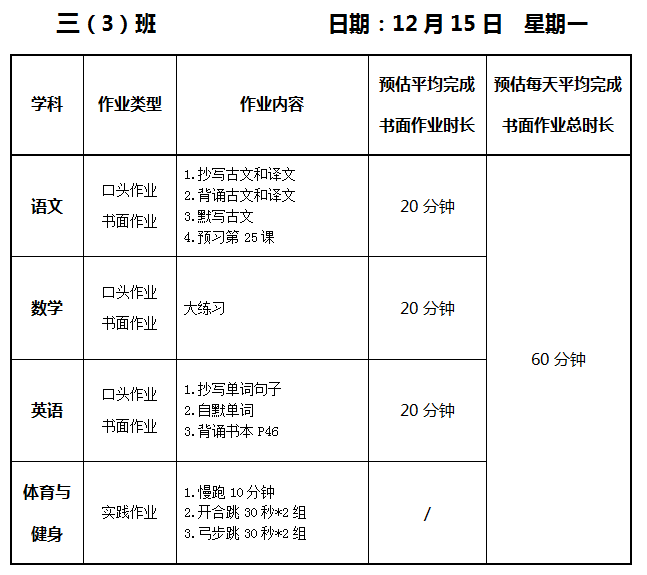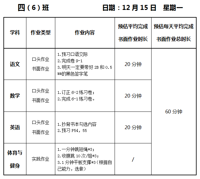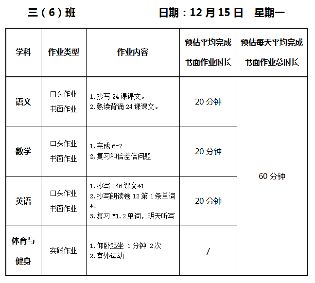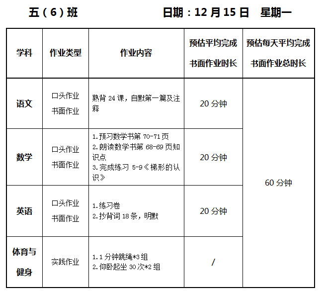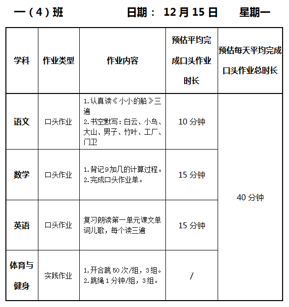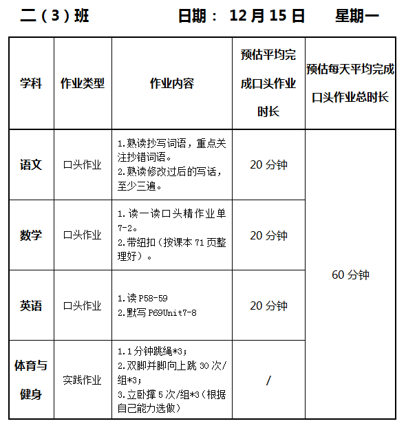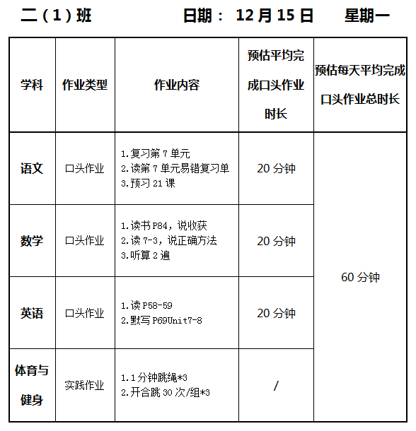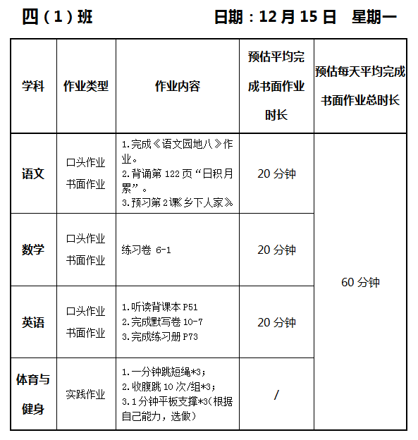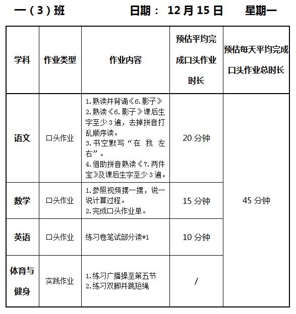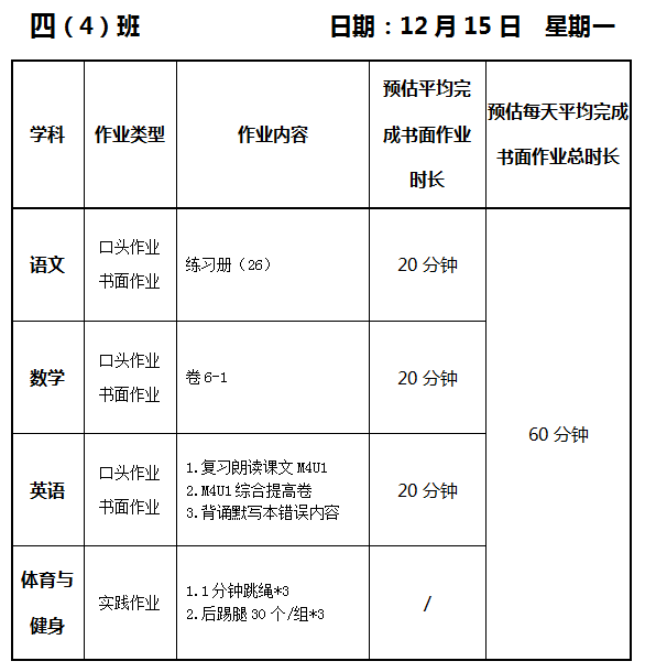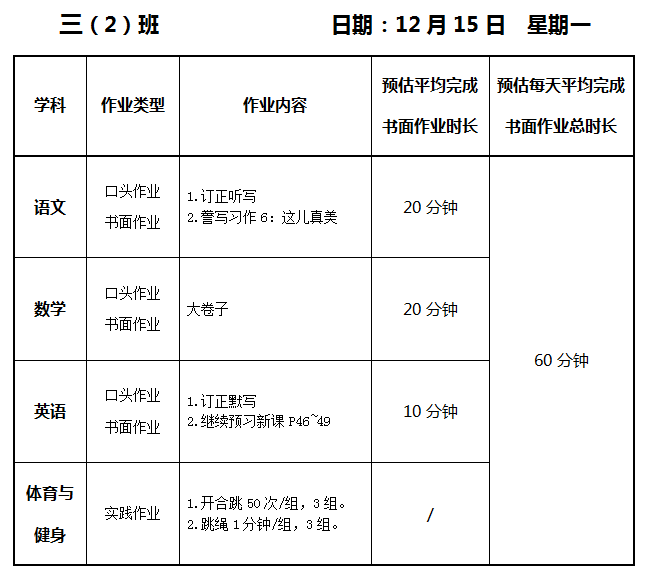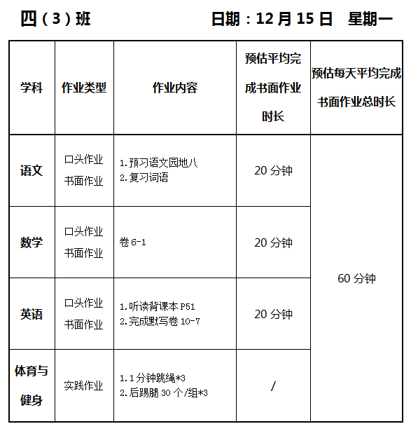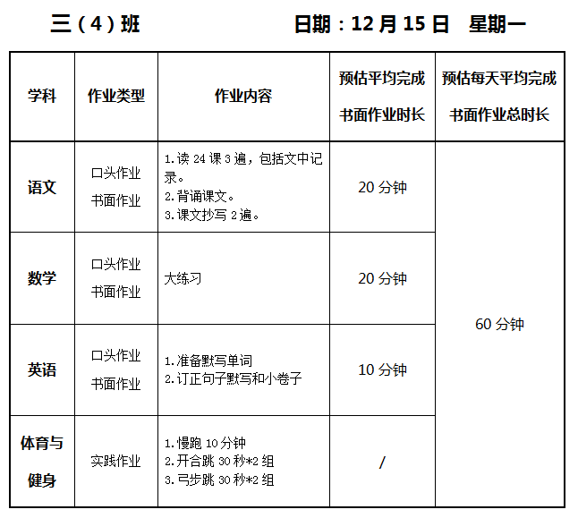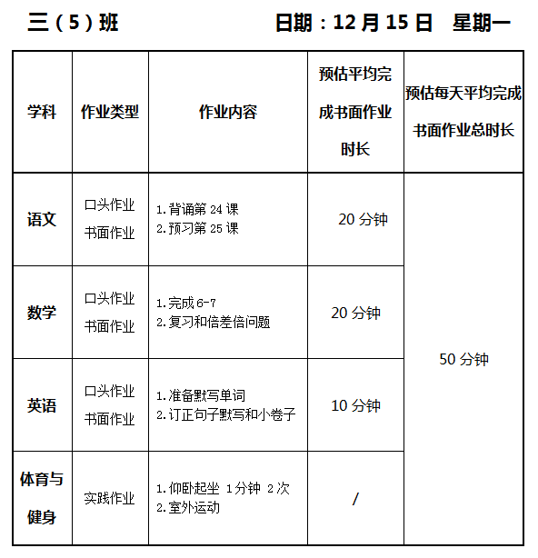 【作业公示】2025学年第一学期南翔小学作业公示(12月15日)