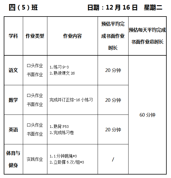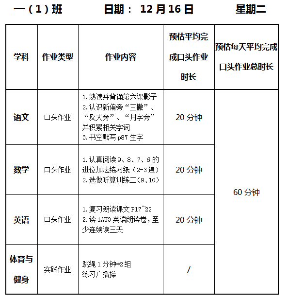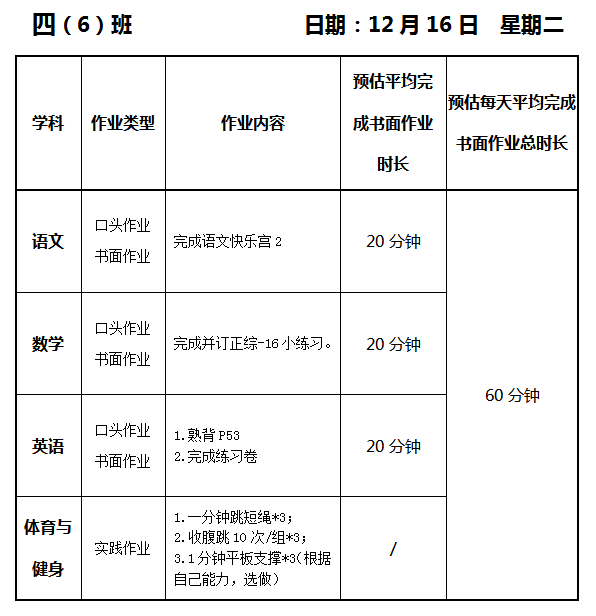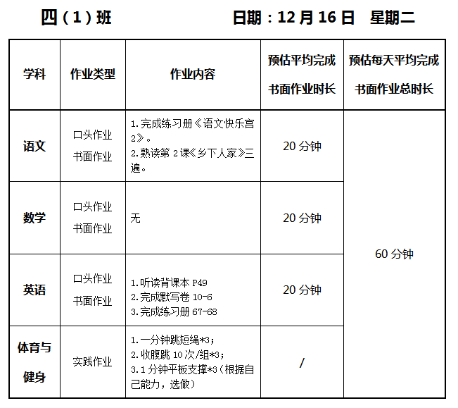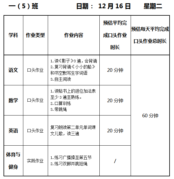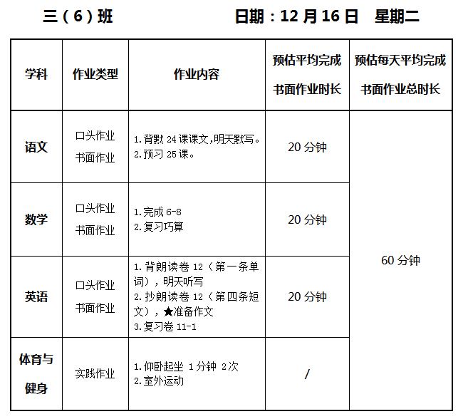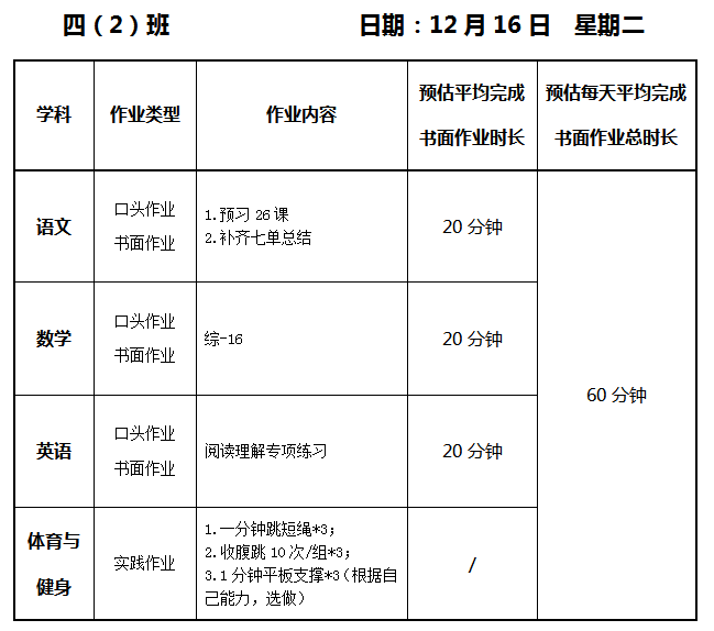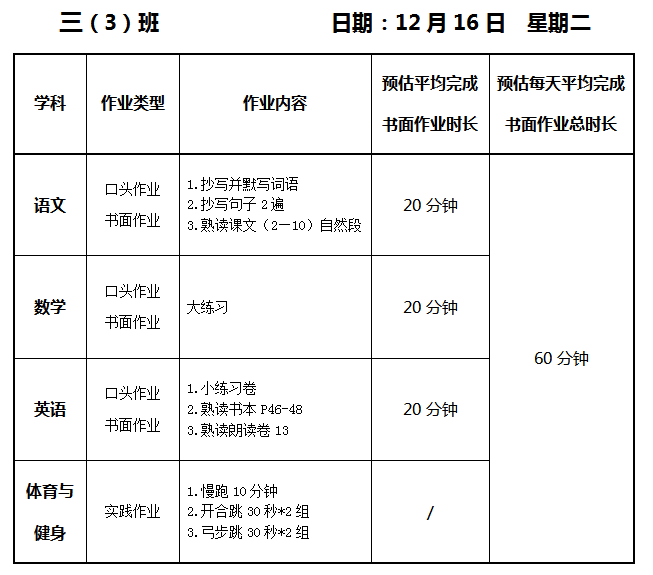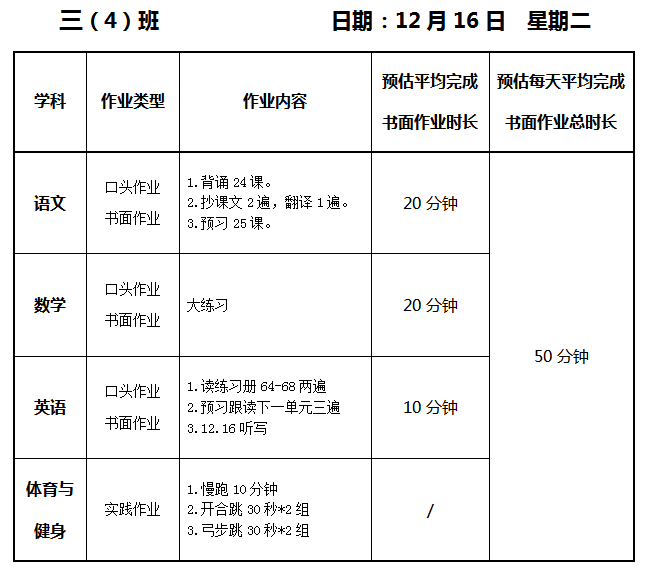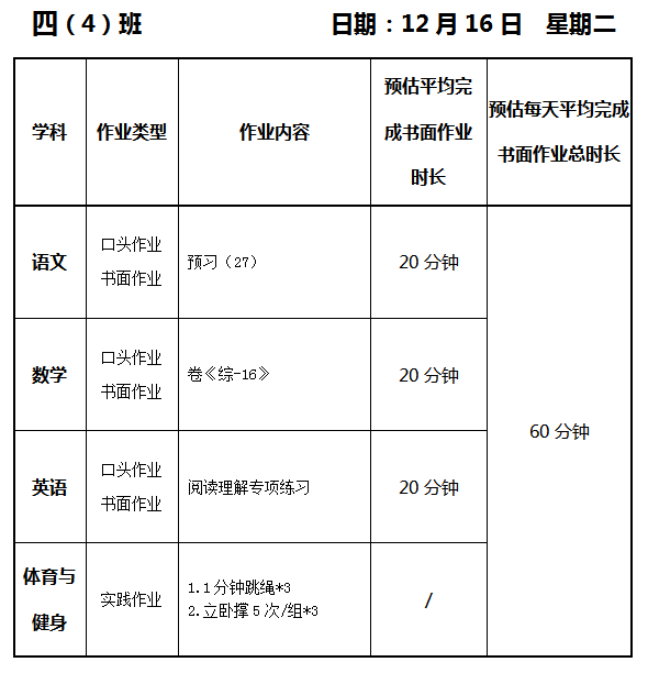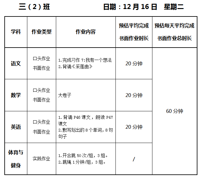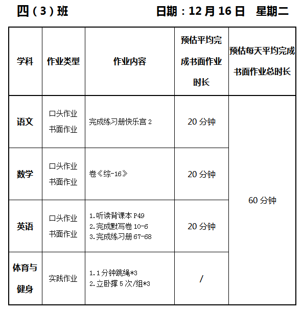 【作业公示】2025学年第一学期南翔小学作业公示(12月16日)