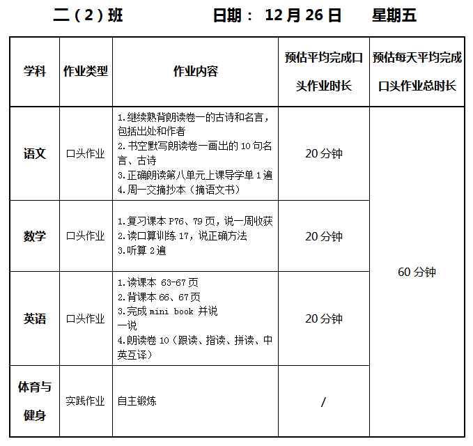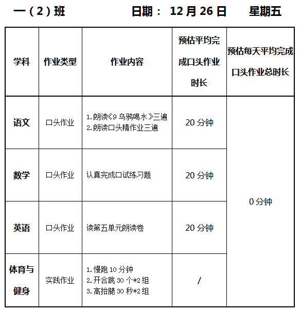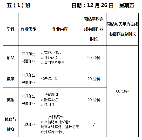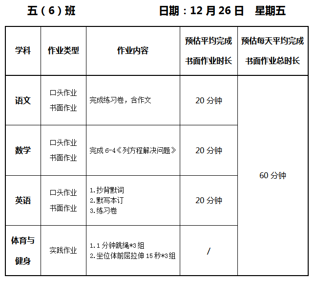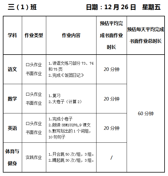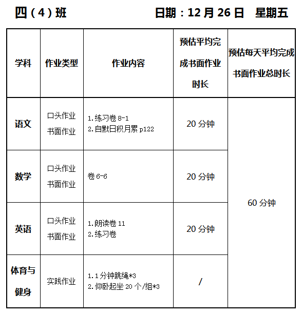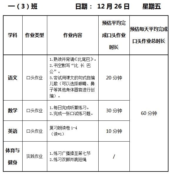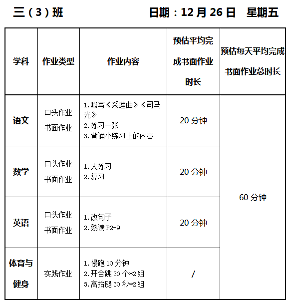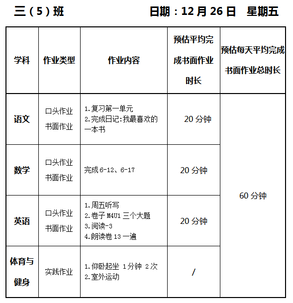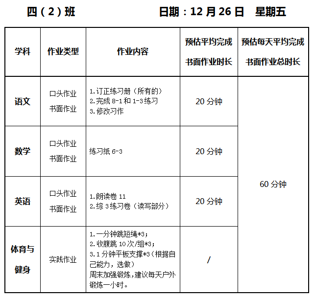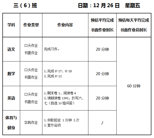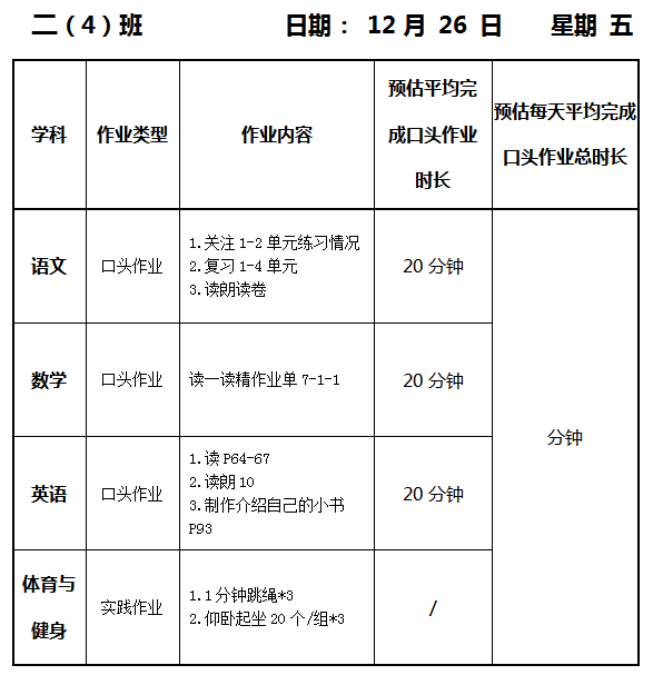 【作业公示】2025学年第一学期南翔小学作业公示(12月26日)
