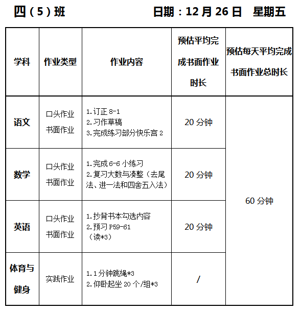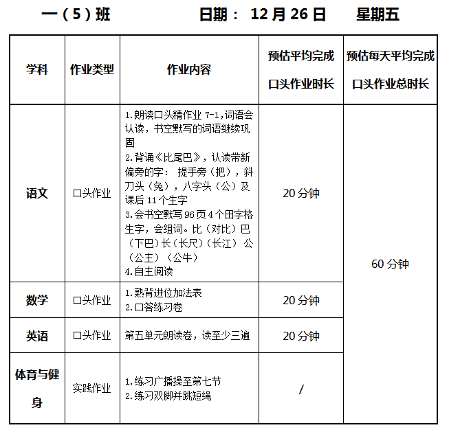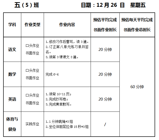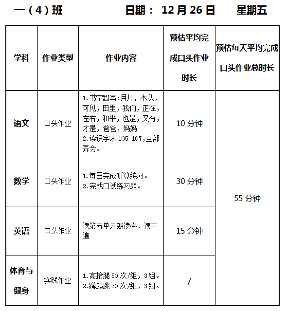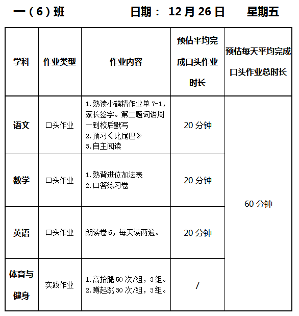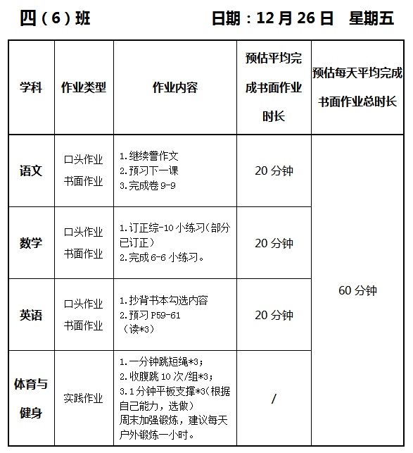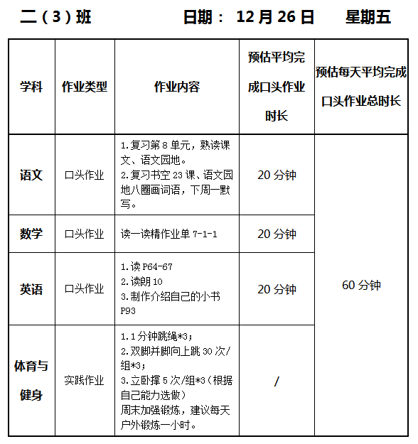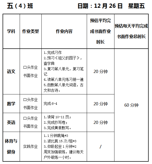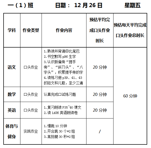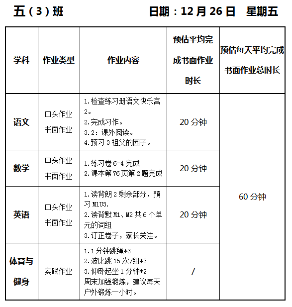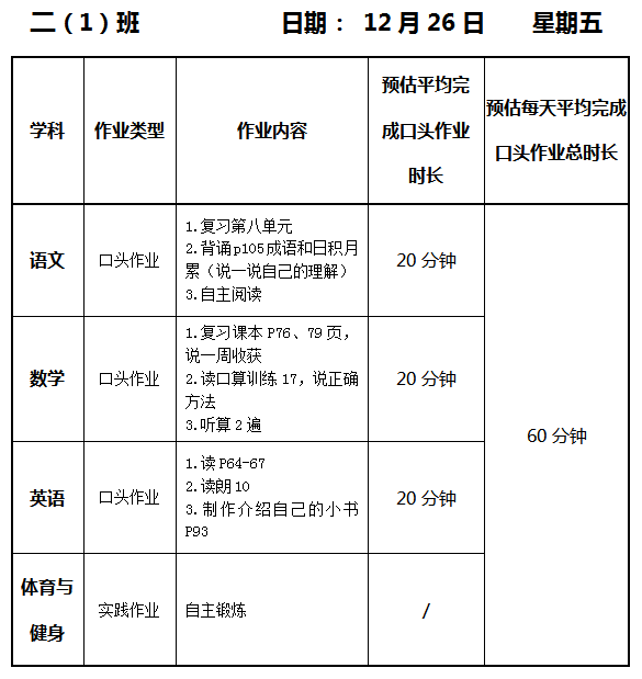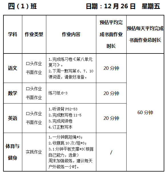 【作业公示】2025学年第一学期南翔小学作业公示(12月26日)
