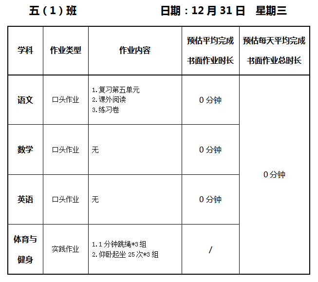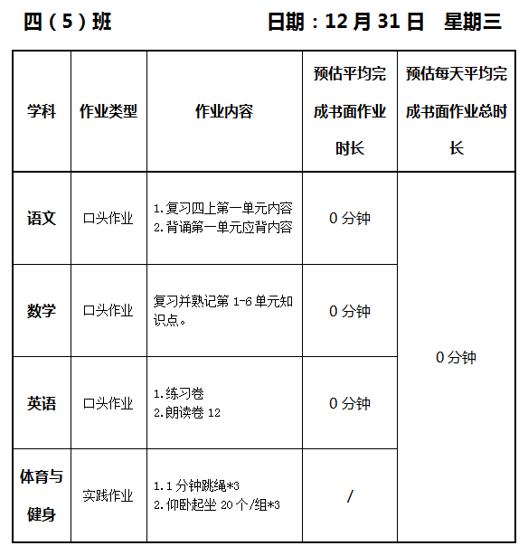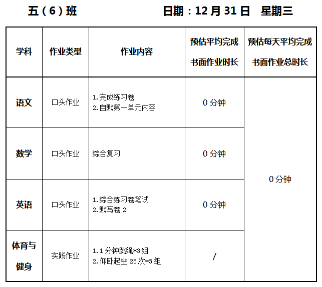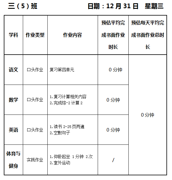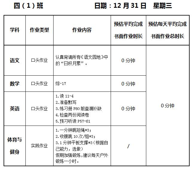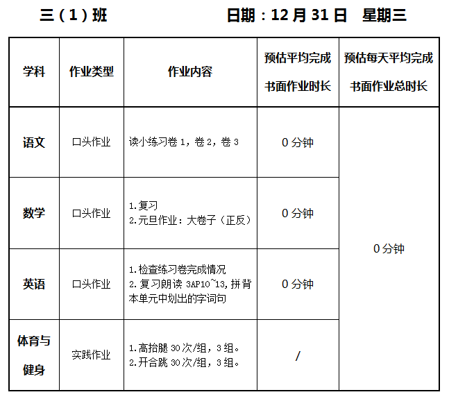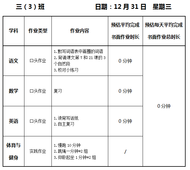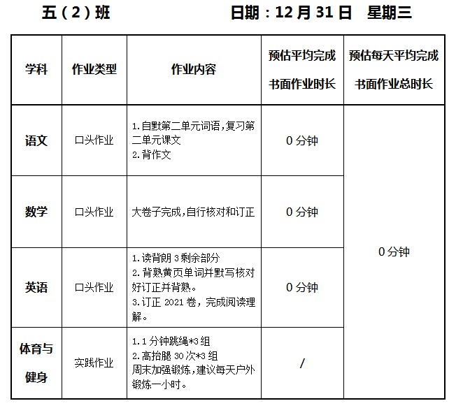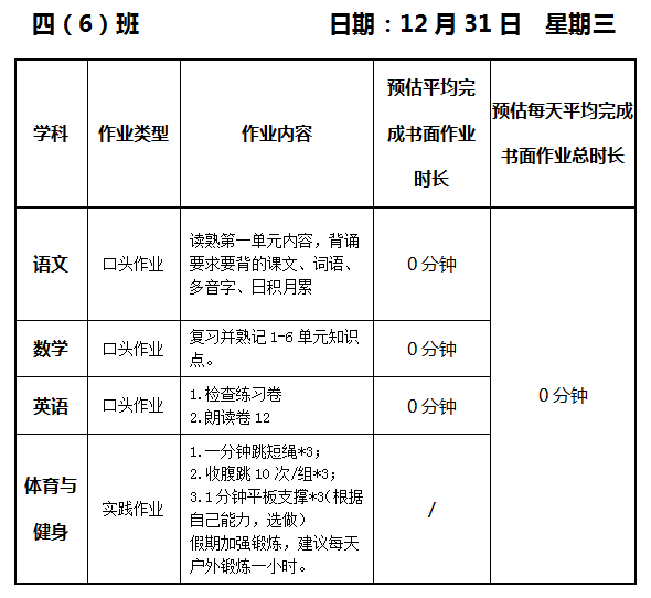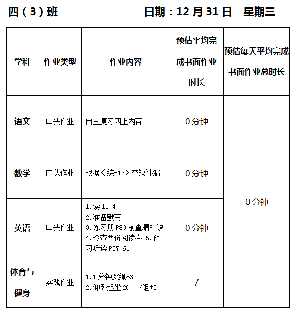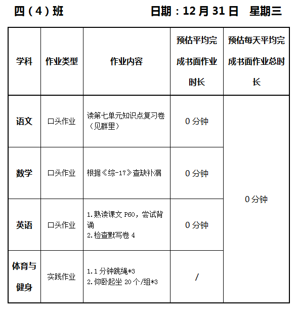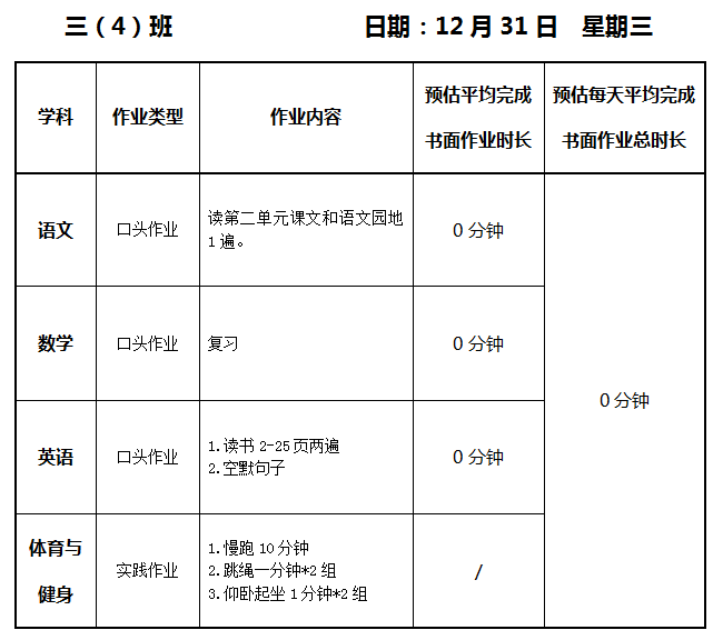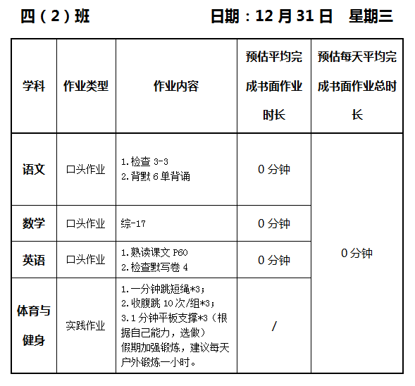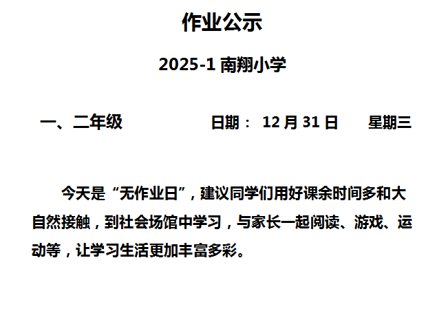 【作业公示】2025学年第一学期南翔小学作业公示(12月31日)