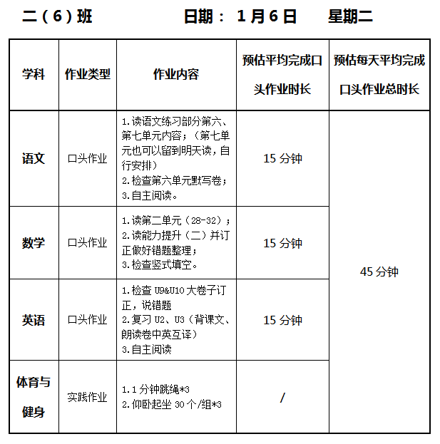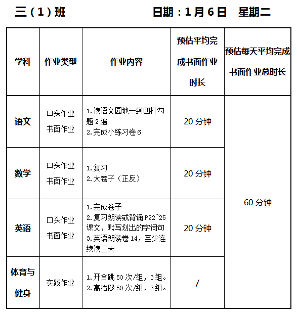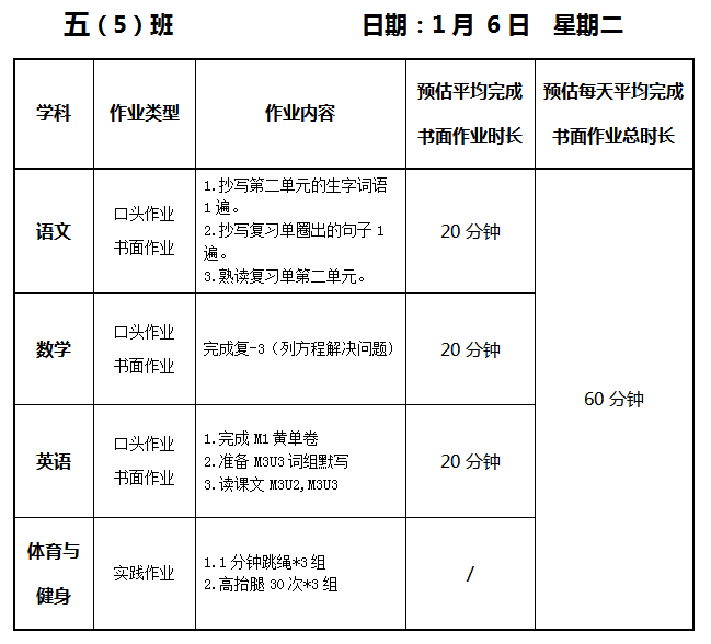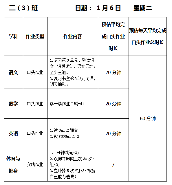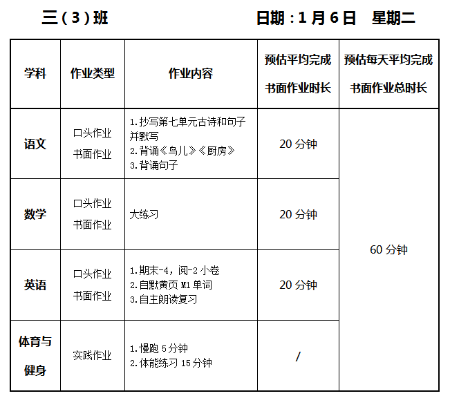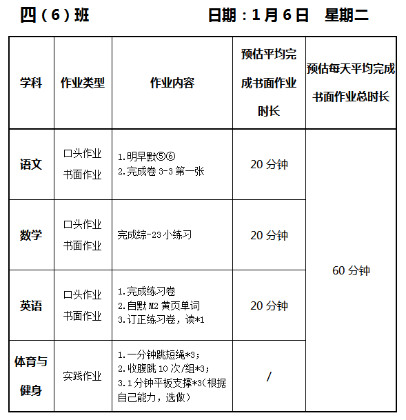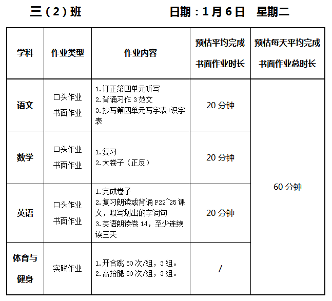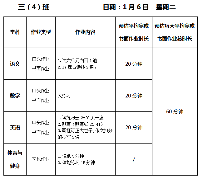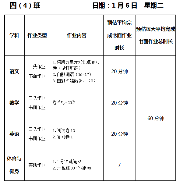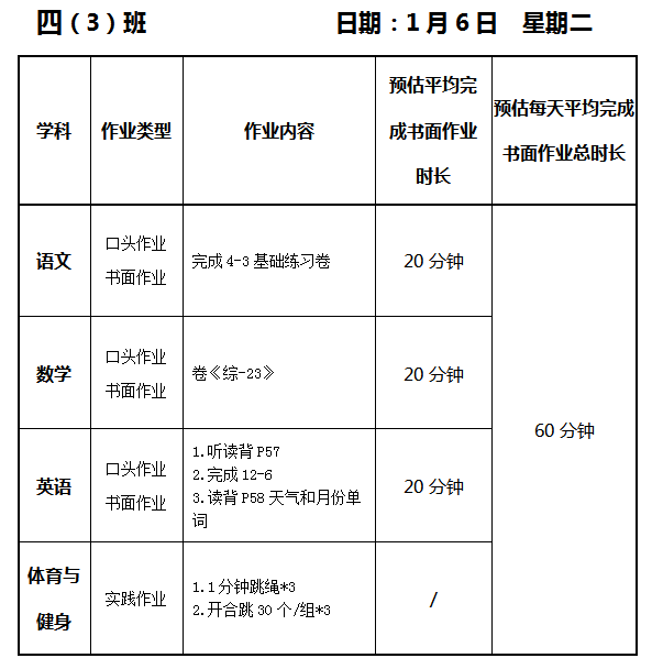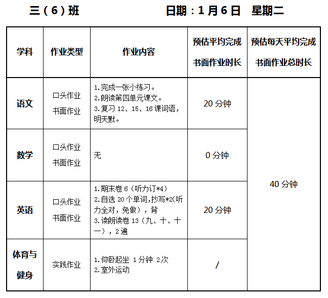 【作业公示】2025学年第一学期南翔小学作业公示(1月6日)
