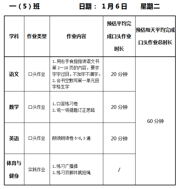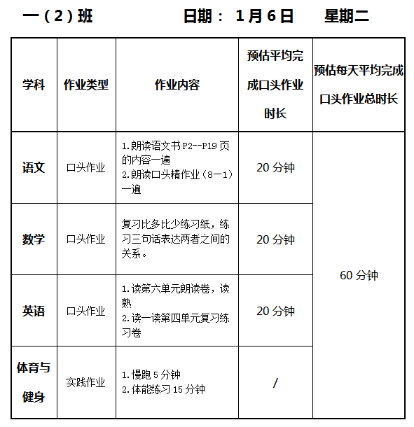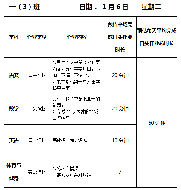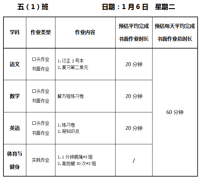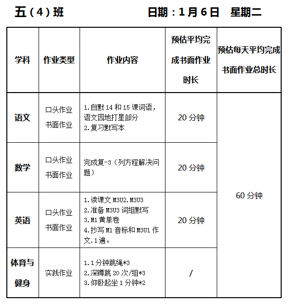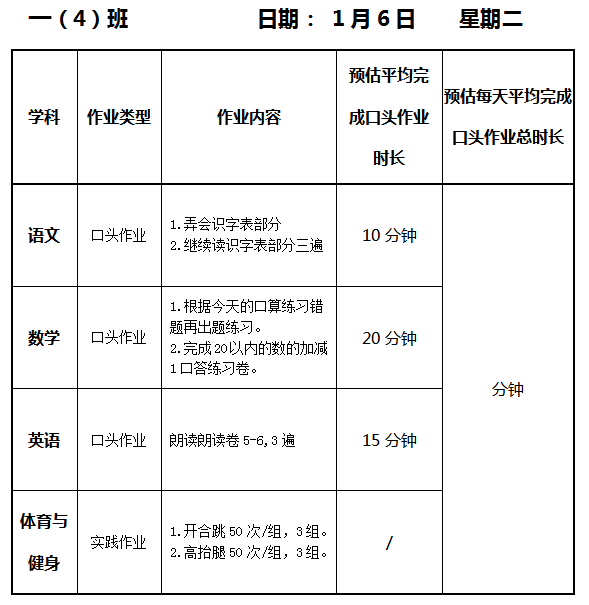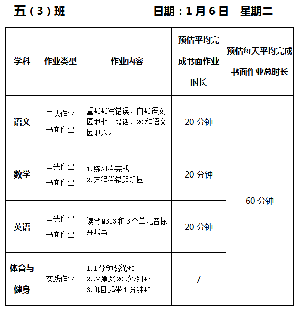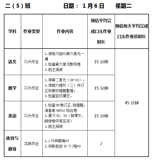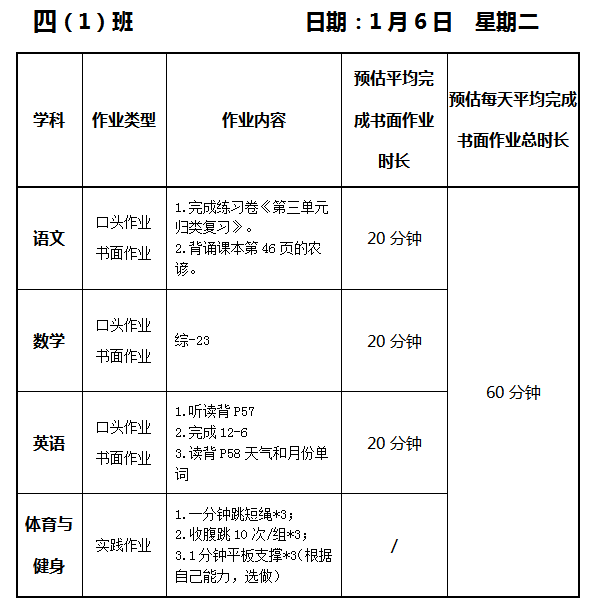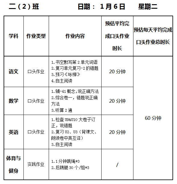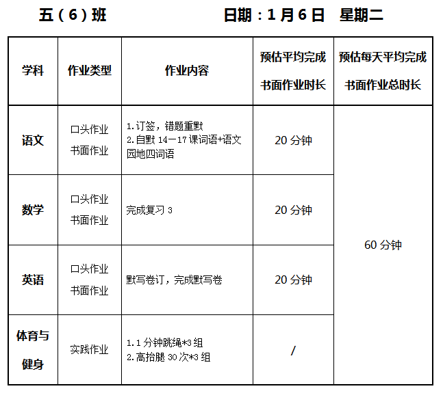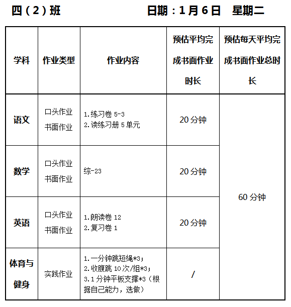 【作业公示】2025学年第一学期南翔小学作业公示(1月6日)