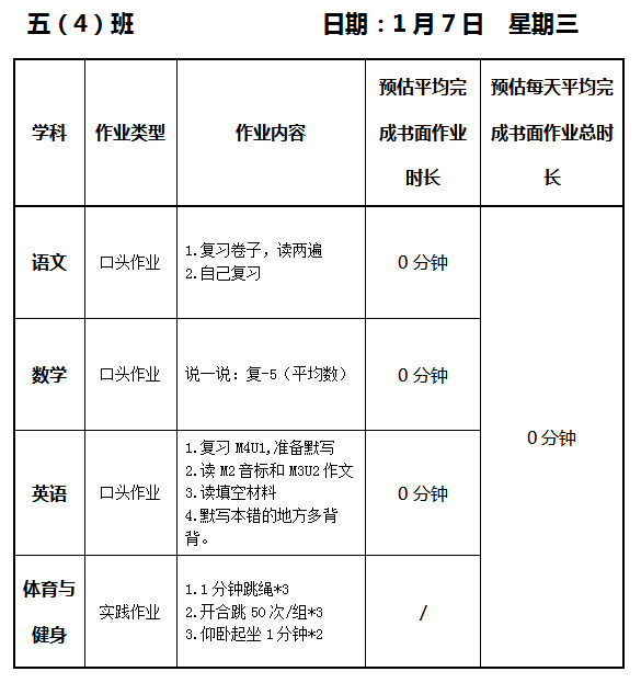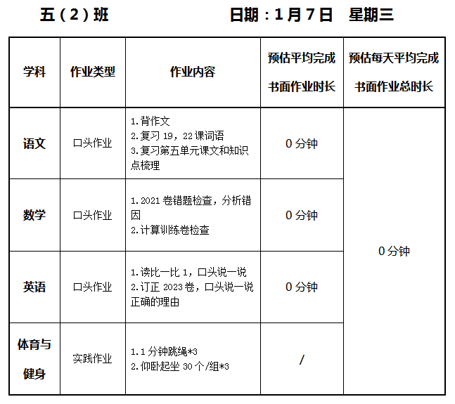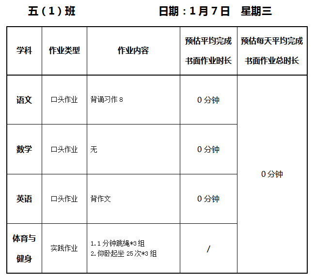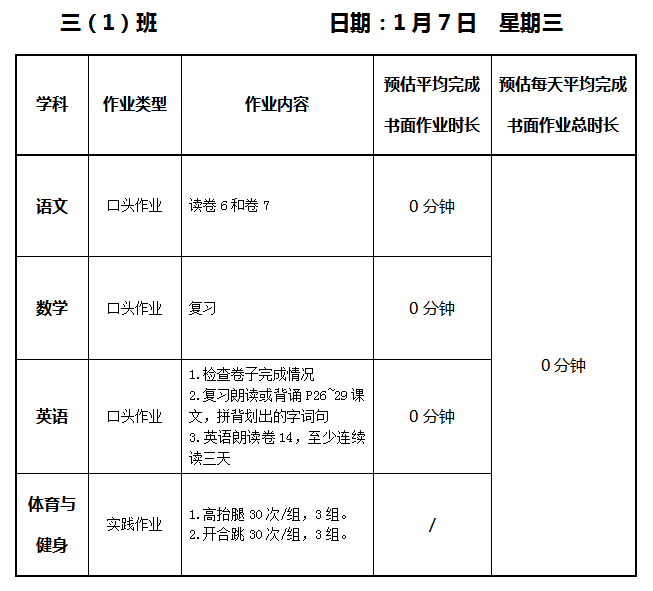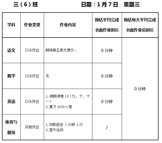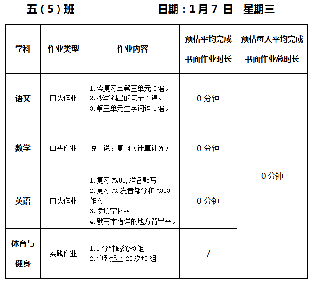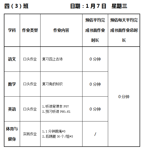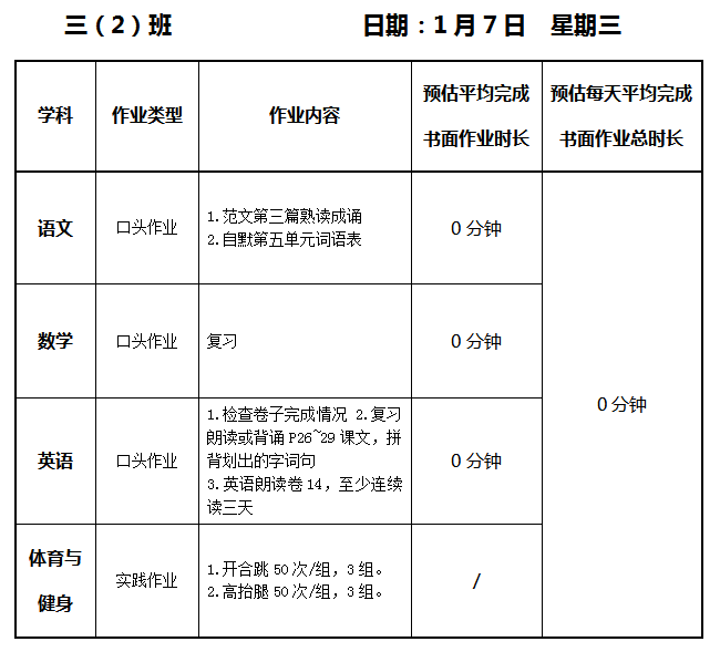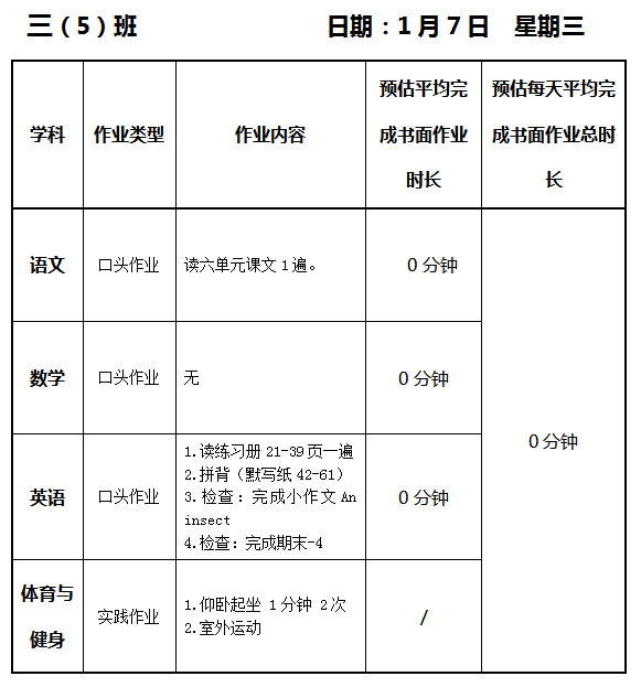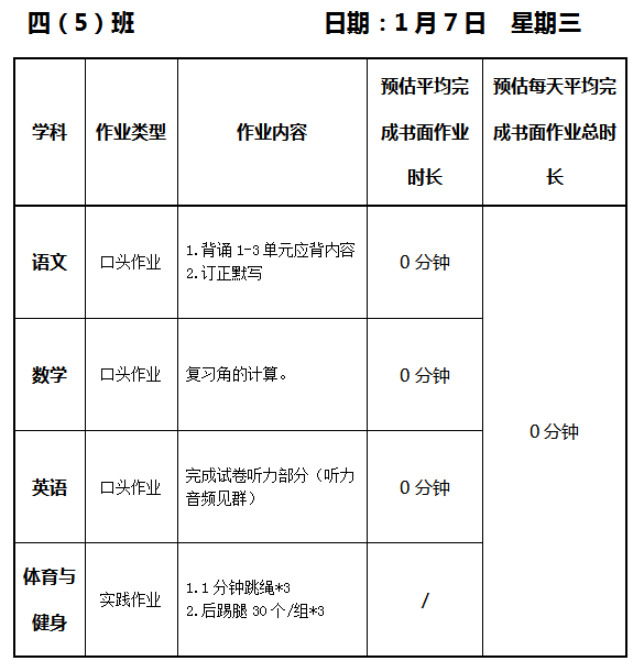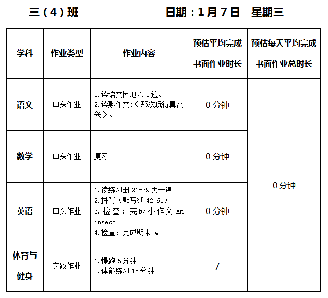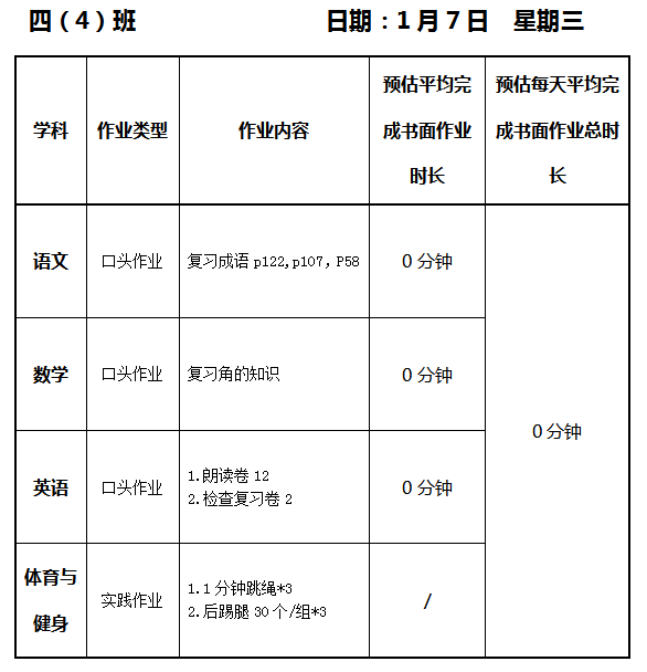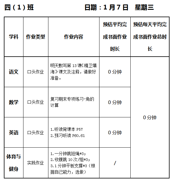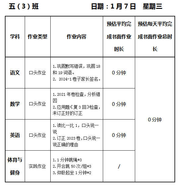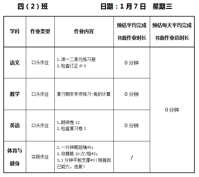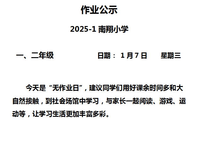 【作业公示】2025学年第一学期南翔小学作业公示(1月7日)