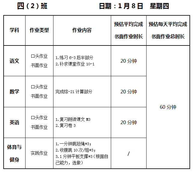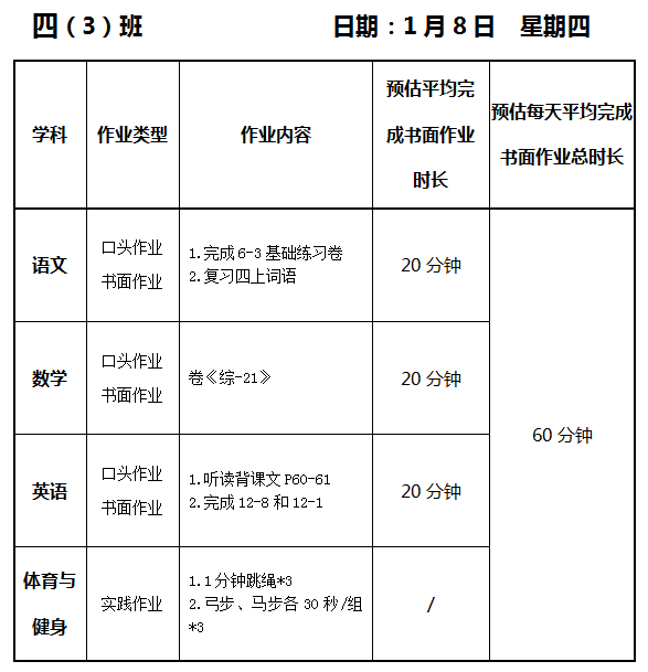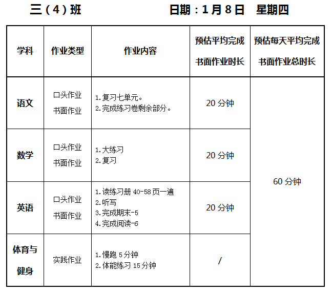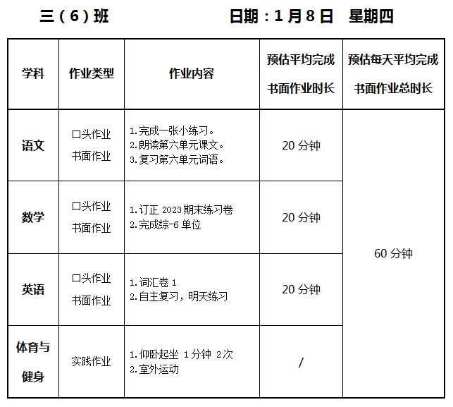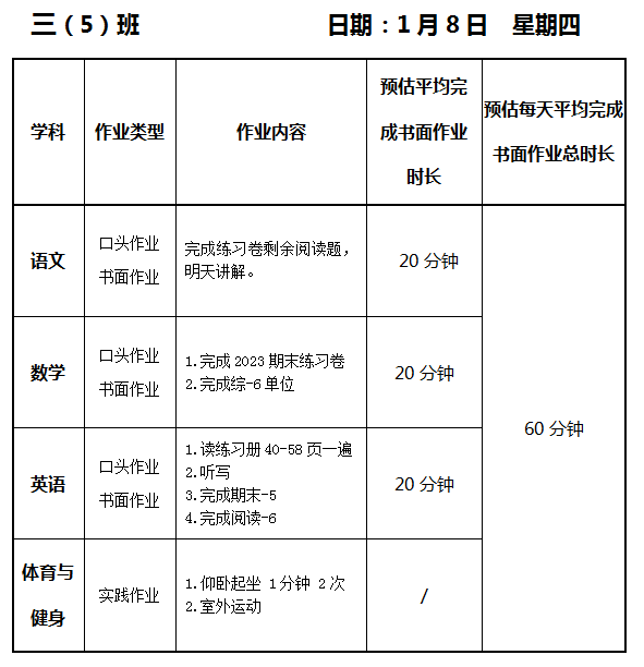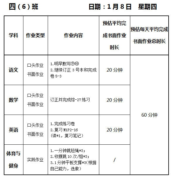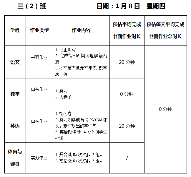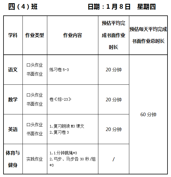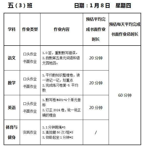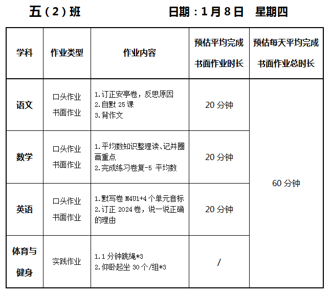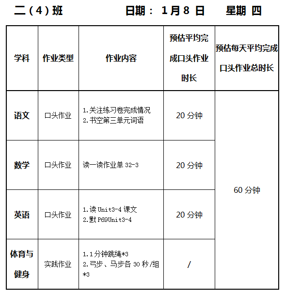 【作业公示】2025学年第一学期南翔小学作业公示(1月8日)