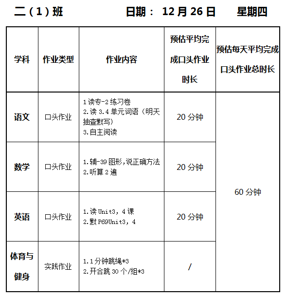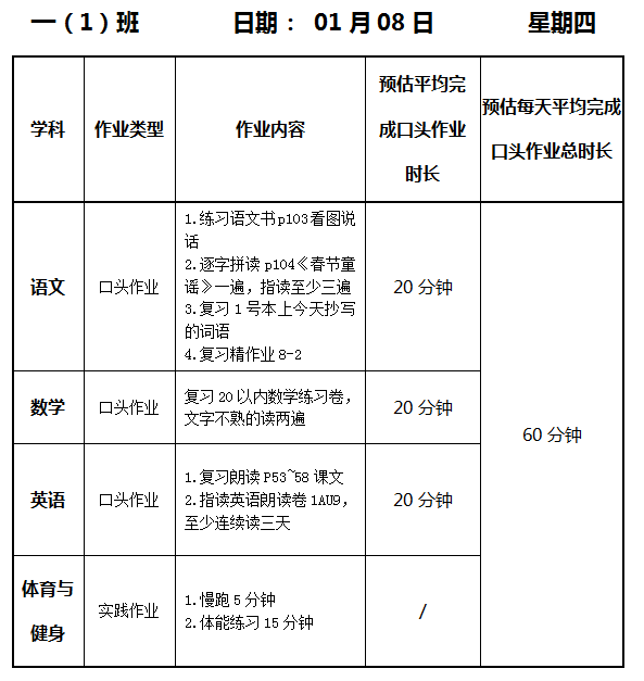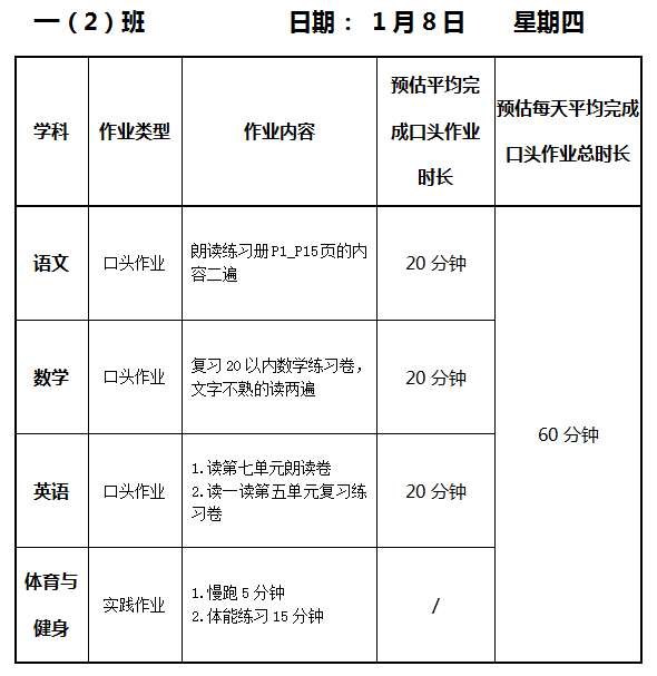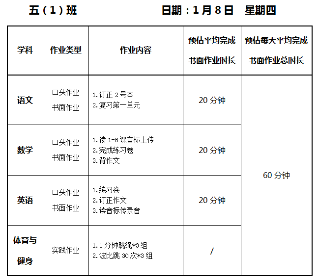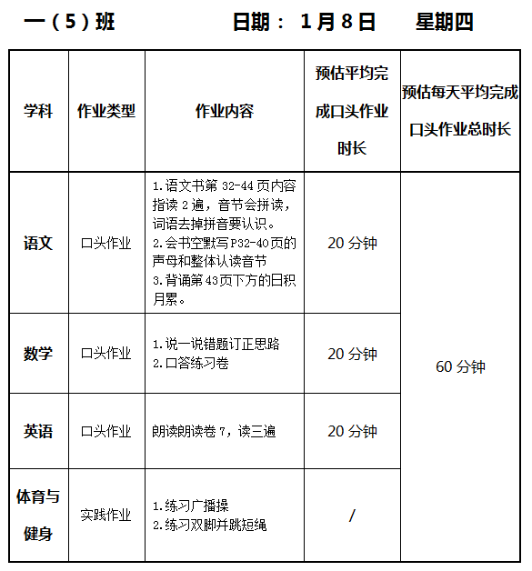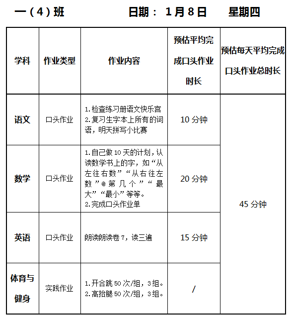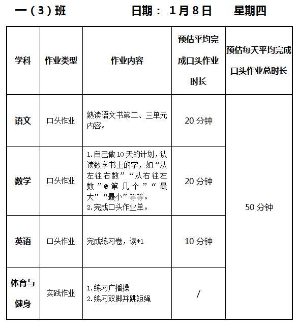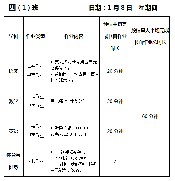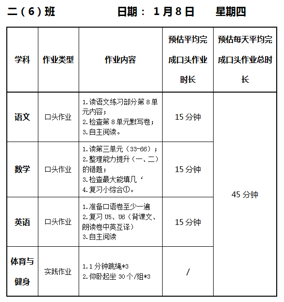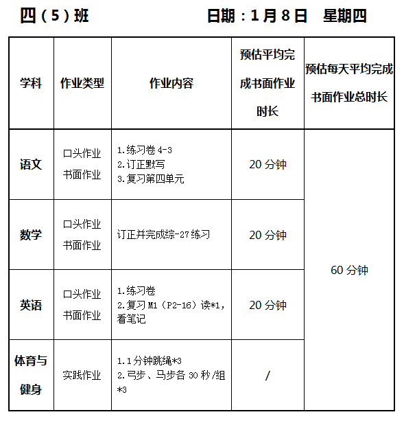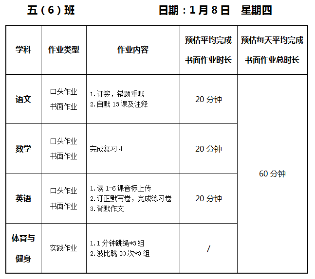 【作业公示】2025学年第一学期南翔小学作业公示(1月8日)