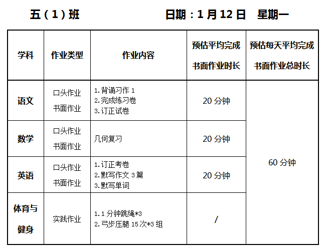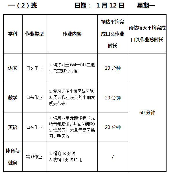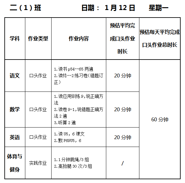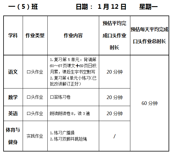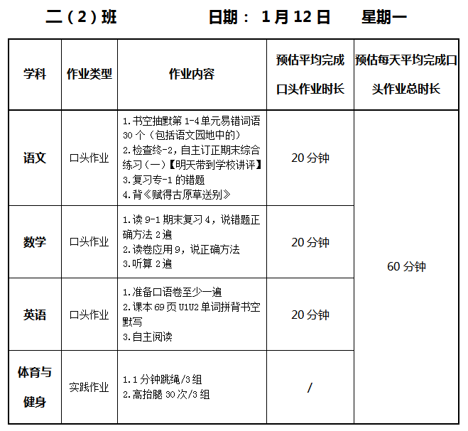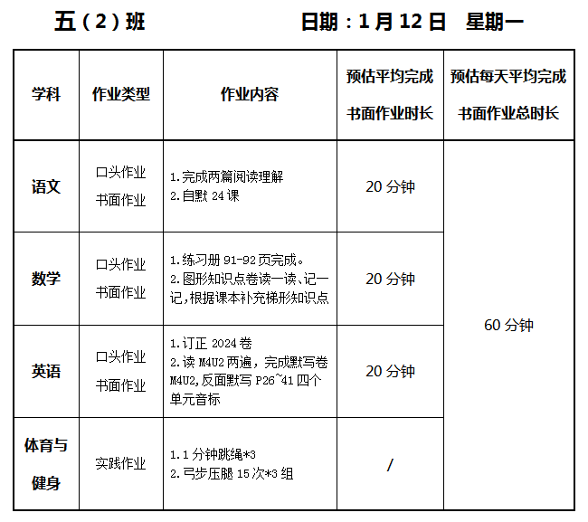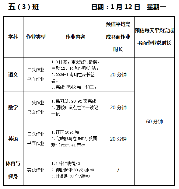 【作业公示】2025学年第一学期南翔小学作业公示(1月12日)