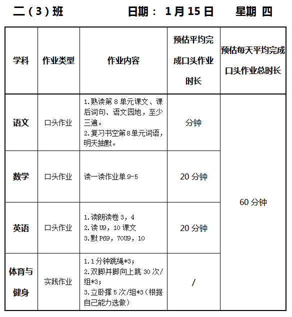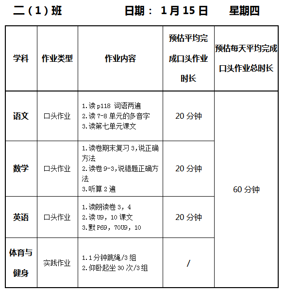 【作业公示】2025学年第一学期南翔小学作业公示(1月15日)