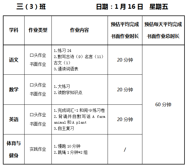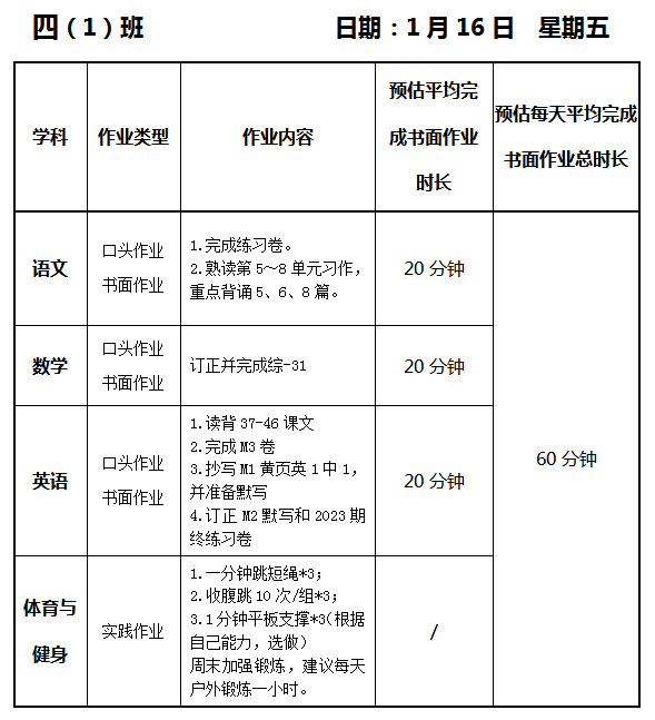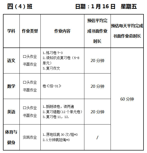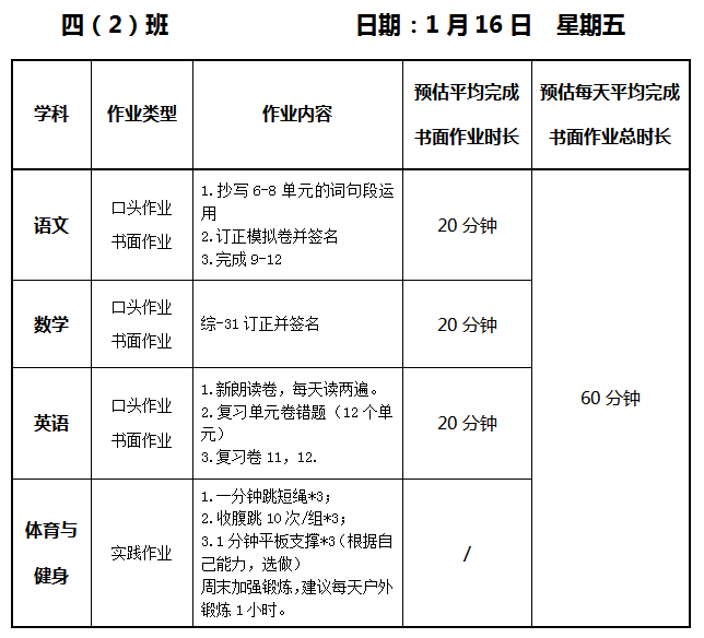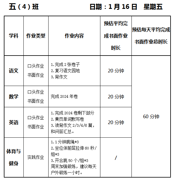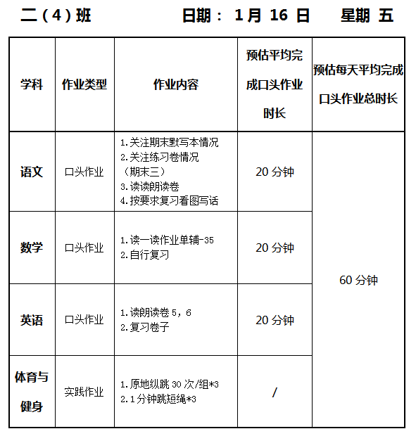 【作业公示】2025学年第一学期南翔小学作业公示(1月16日)