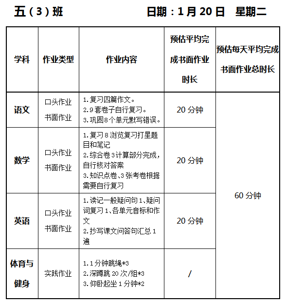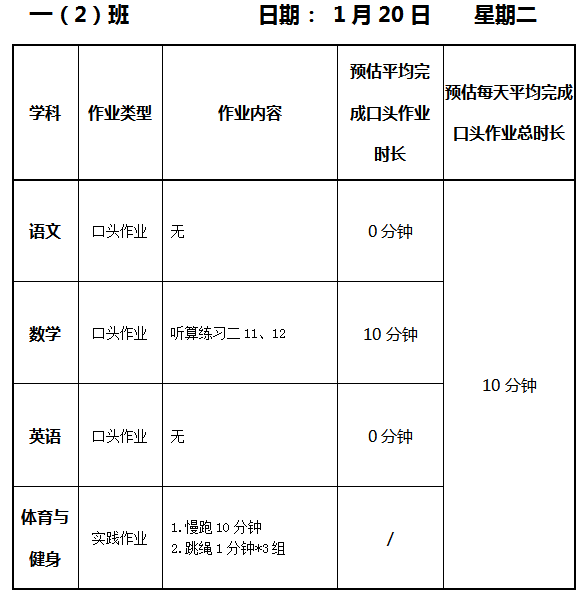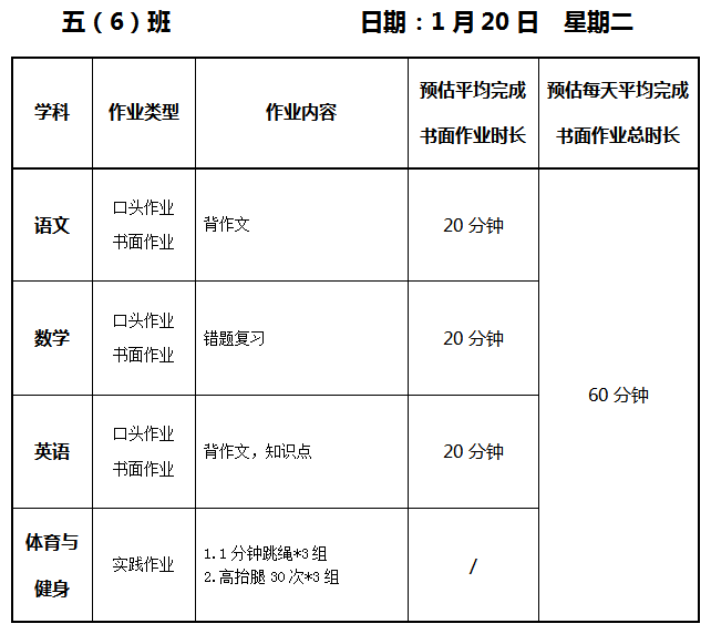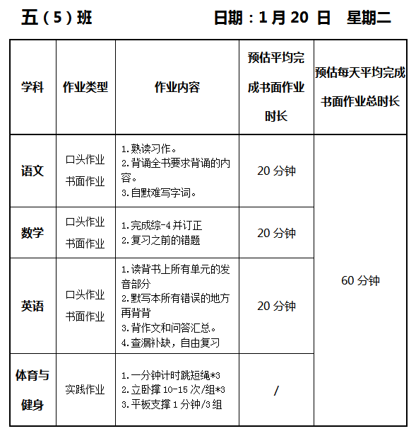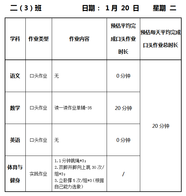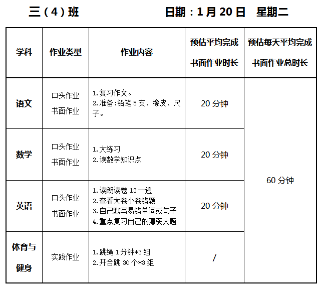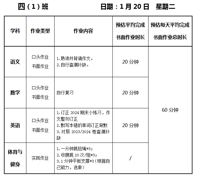 【作业公示】2025学年第一学期南翔小学作业公示(1月20日)