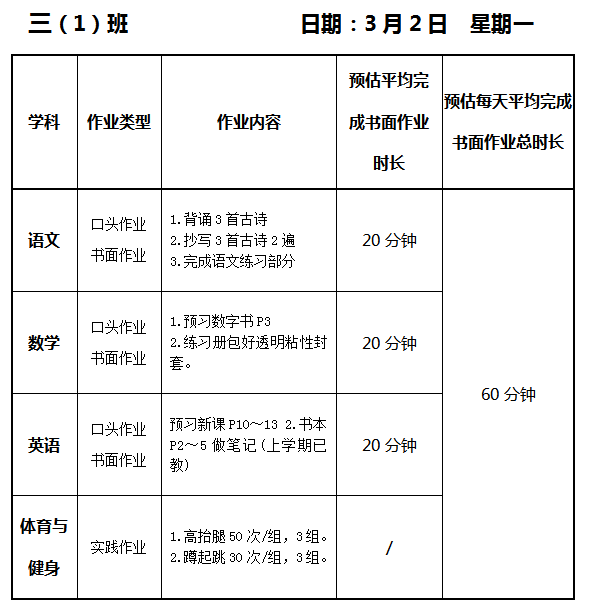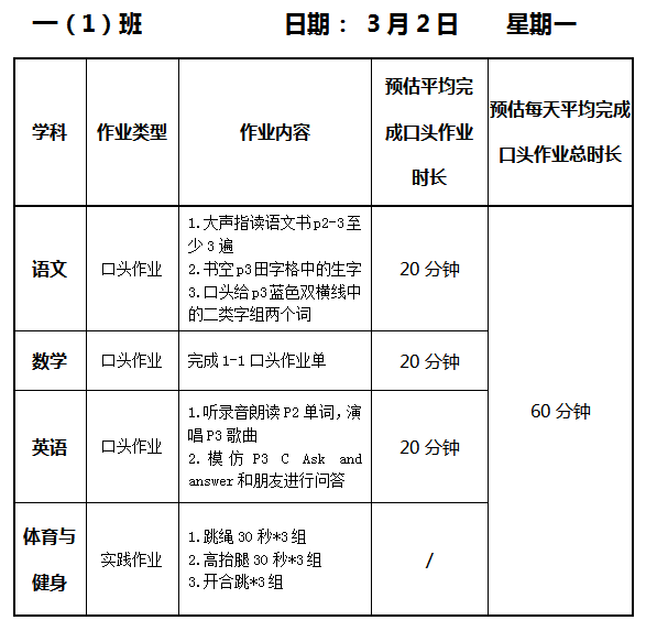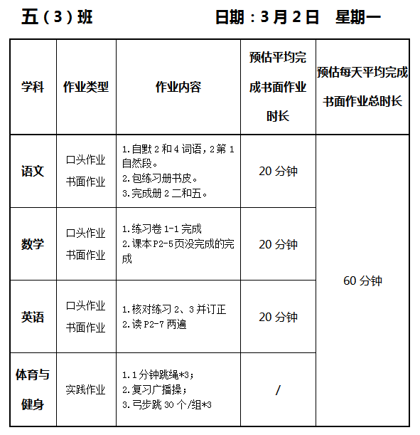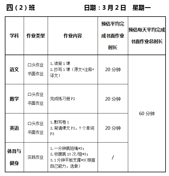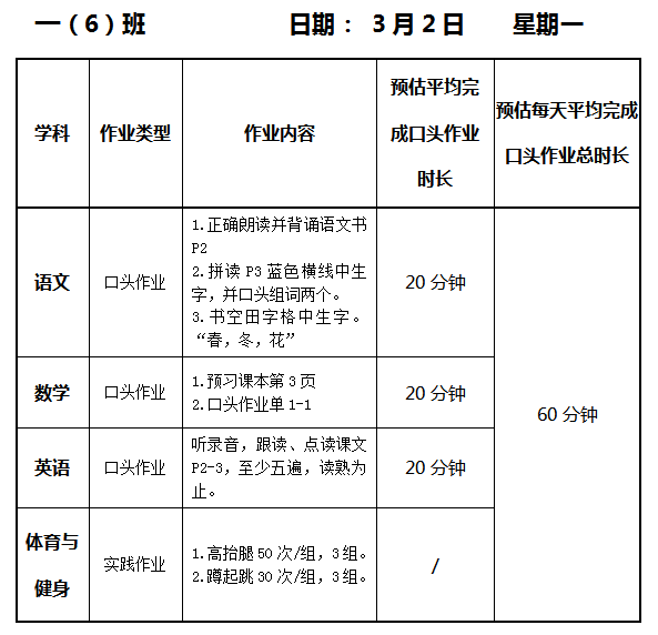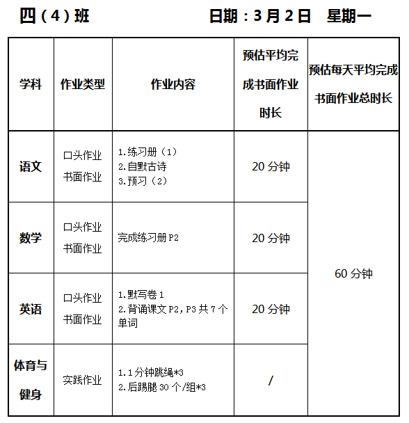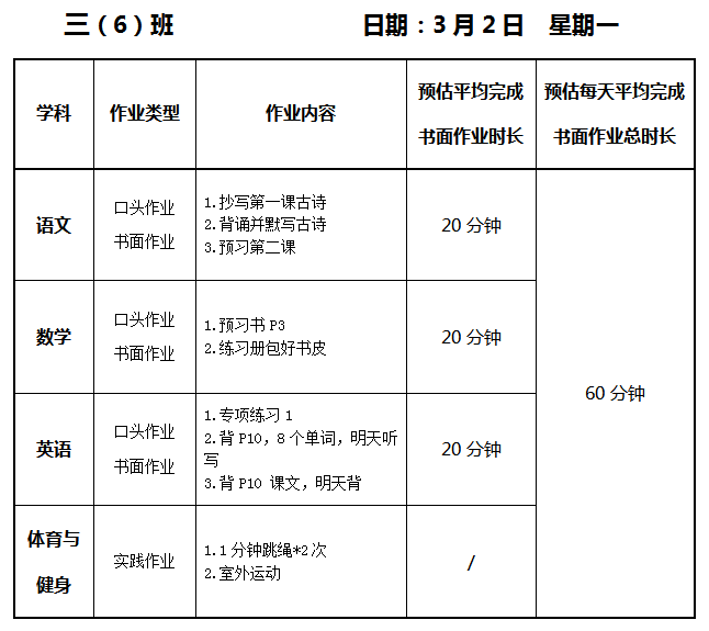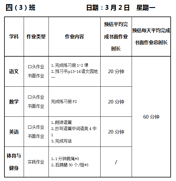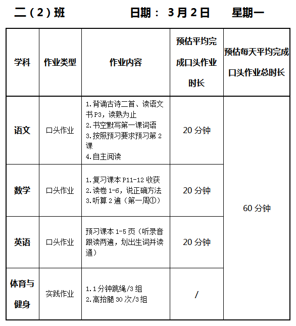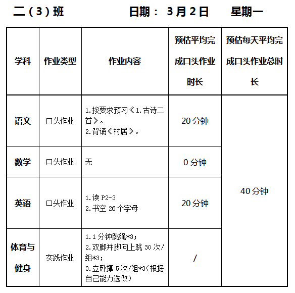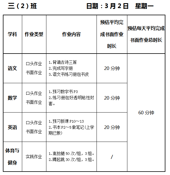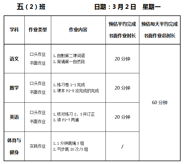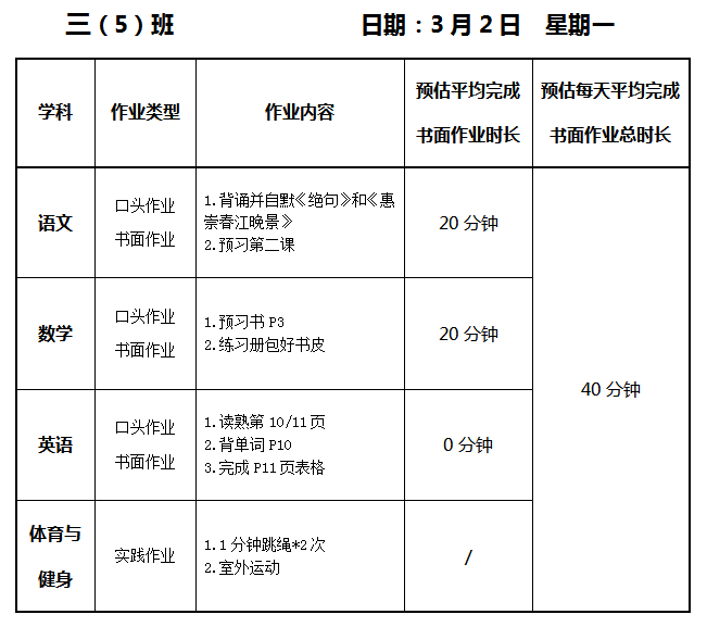 【作业公示】2025学年第二学期南翔小学作业公示(3月2日)