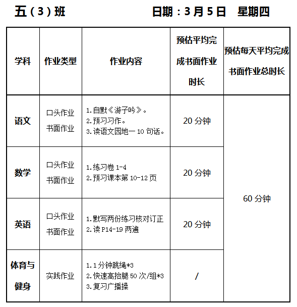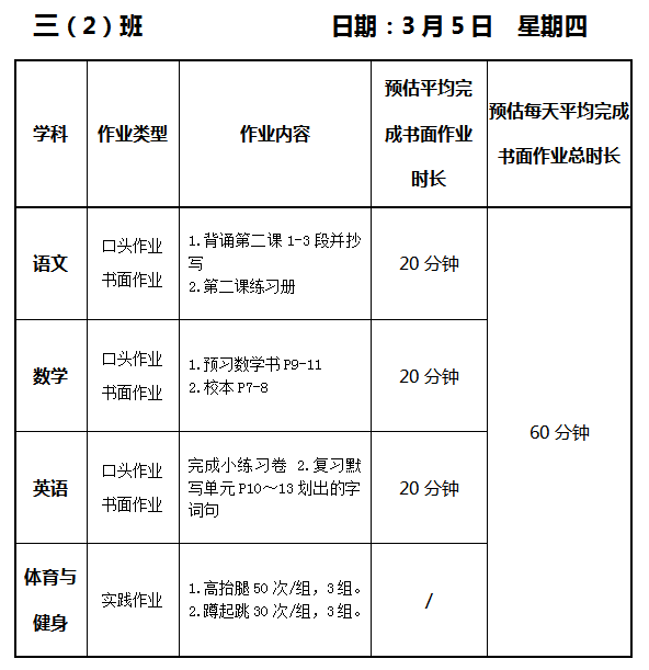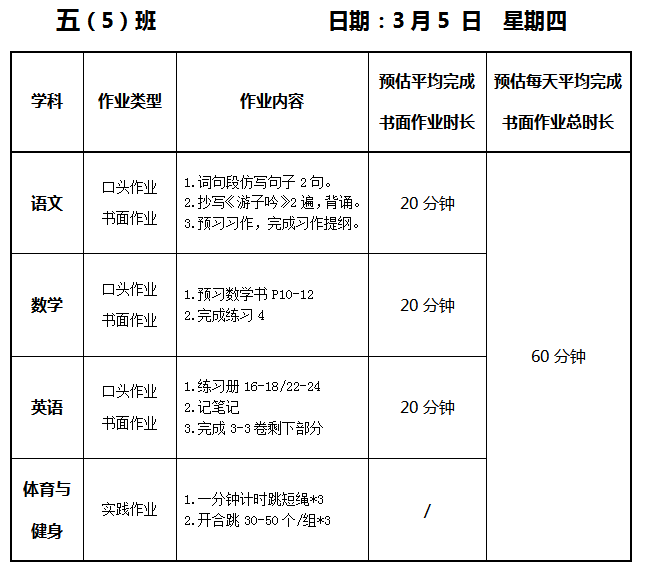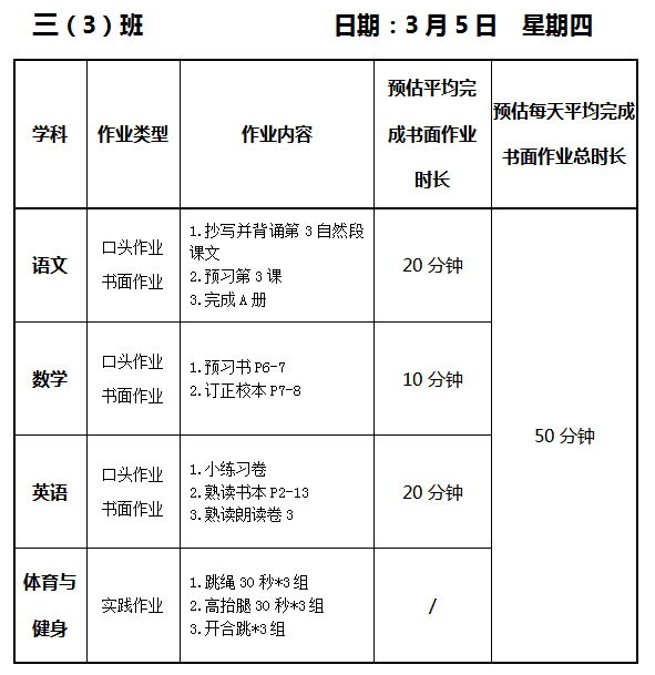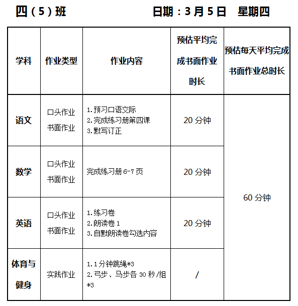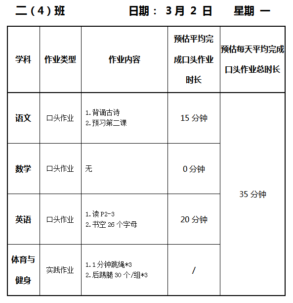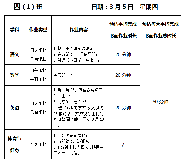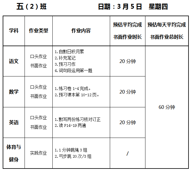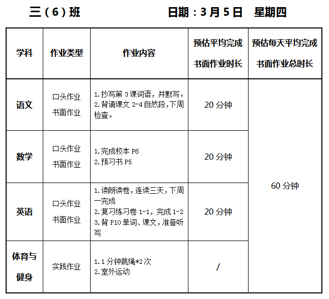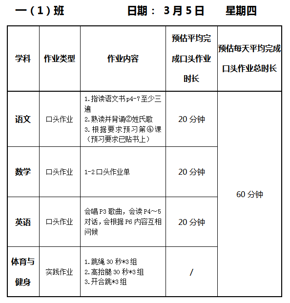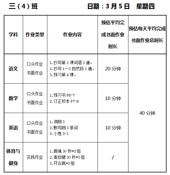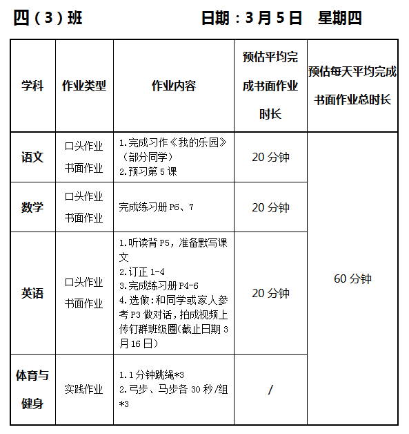 【作业公示】2025学年第二学期南翔小学作业公示(3月5日)