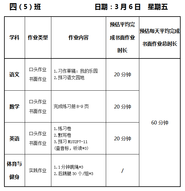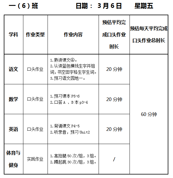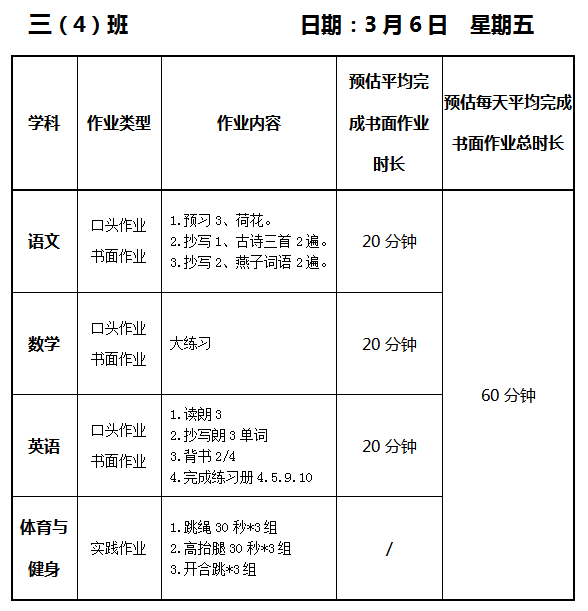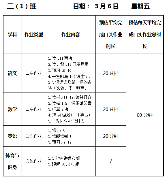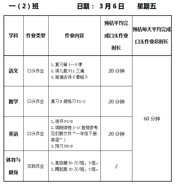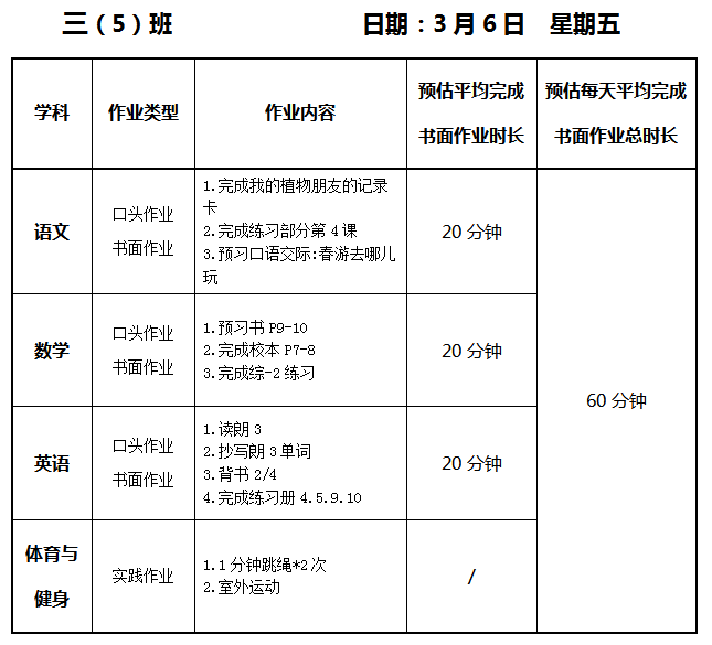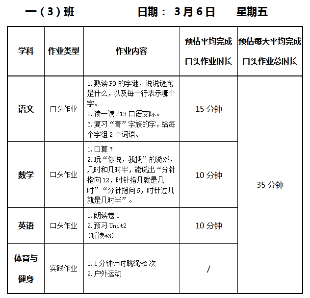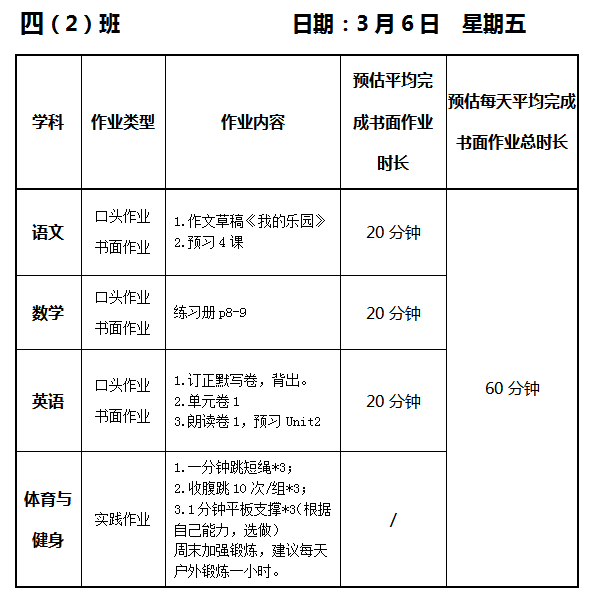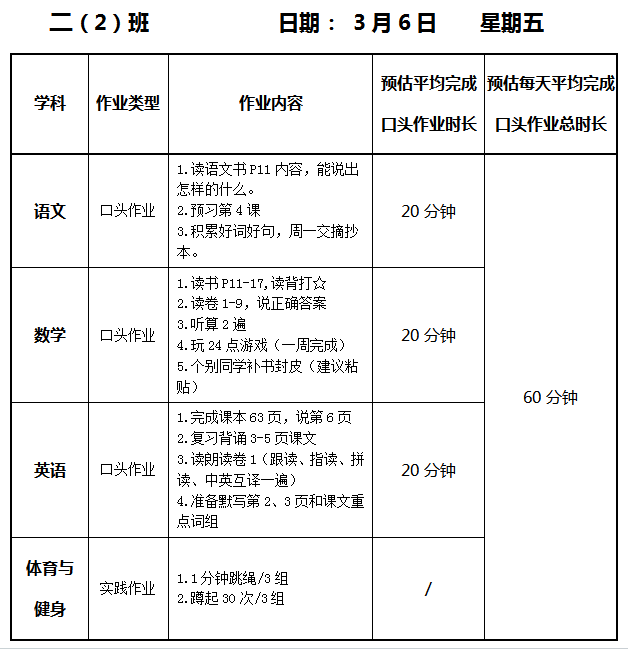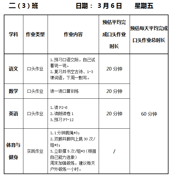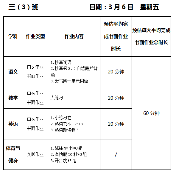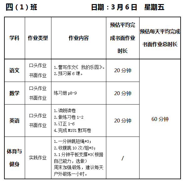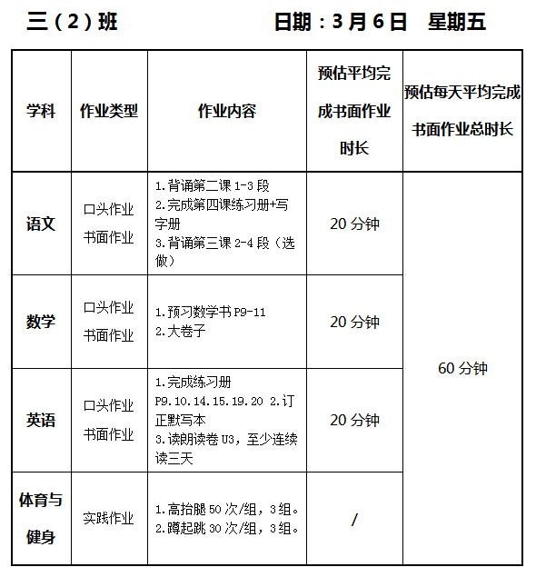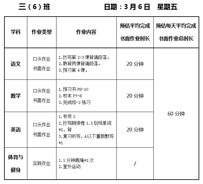 【作业公示】2025学年第二学期南翔小学作业公示(3月6日)
